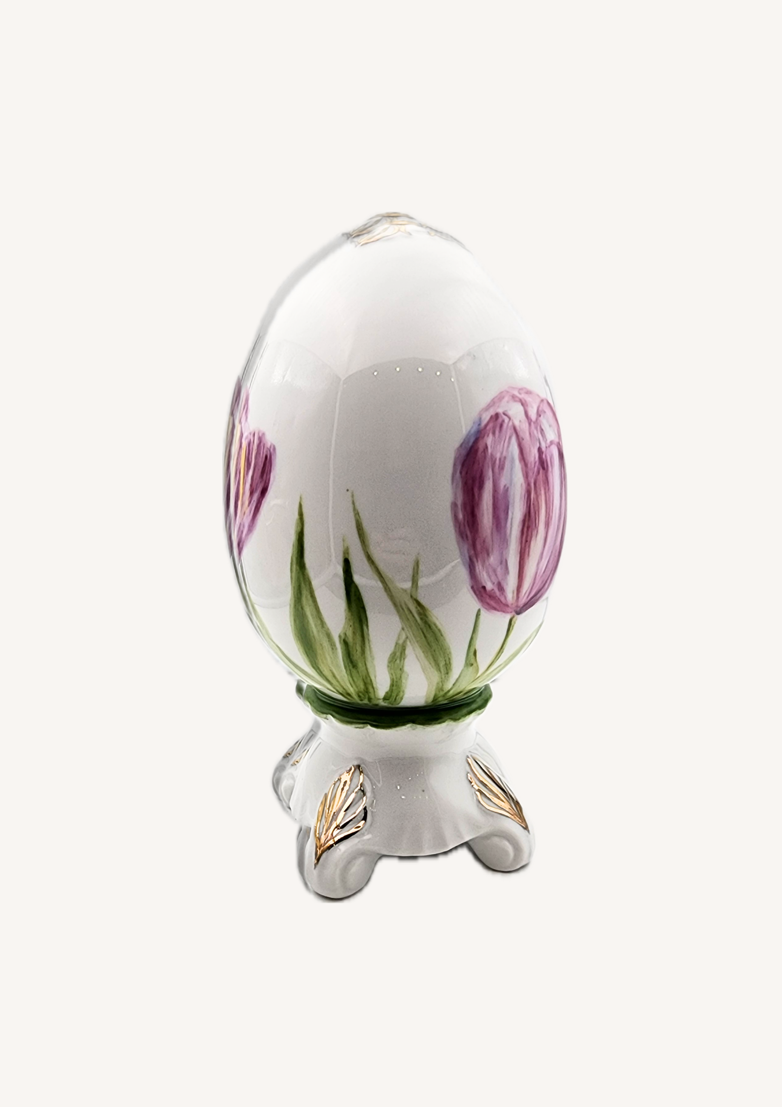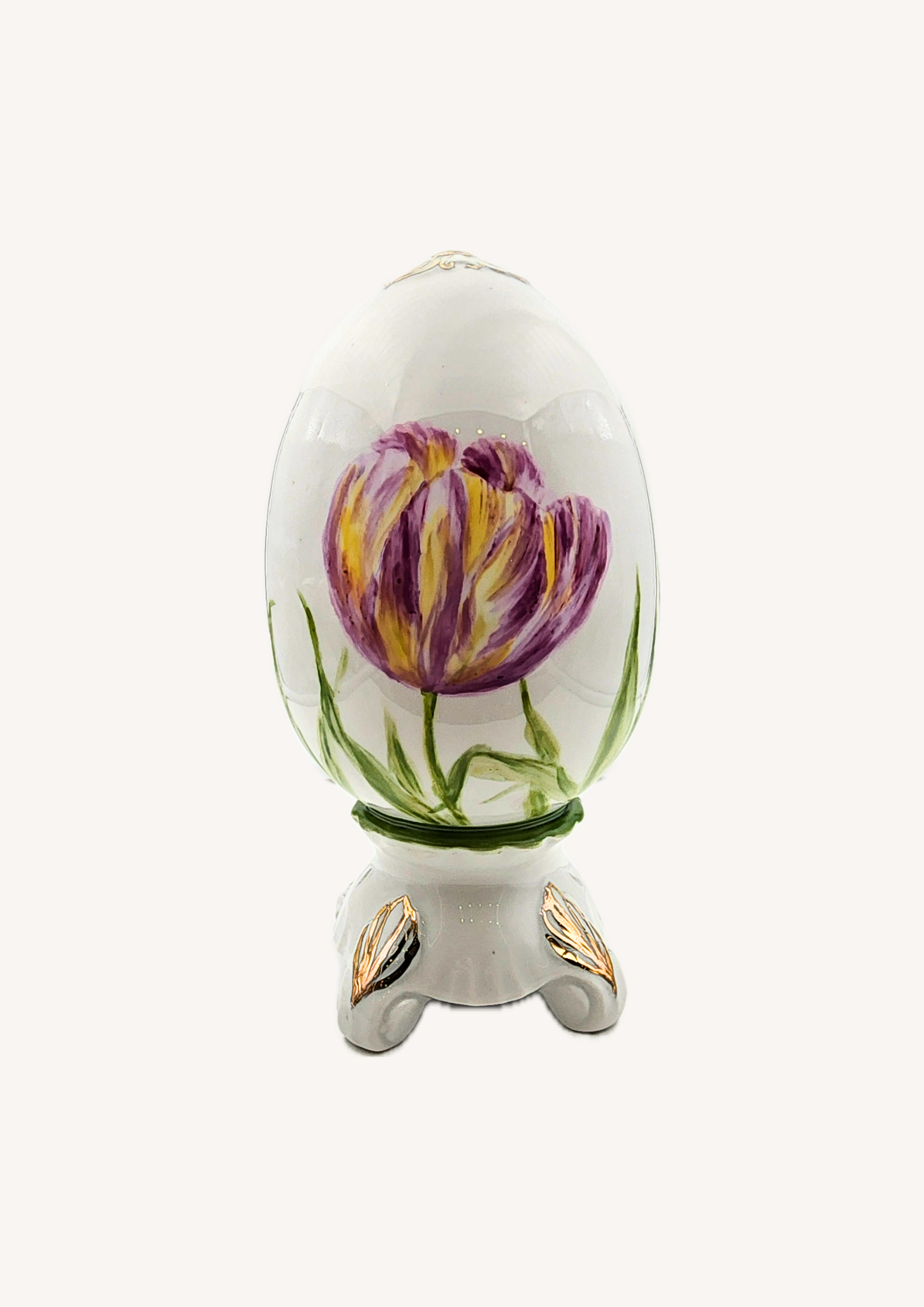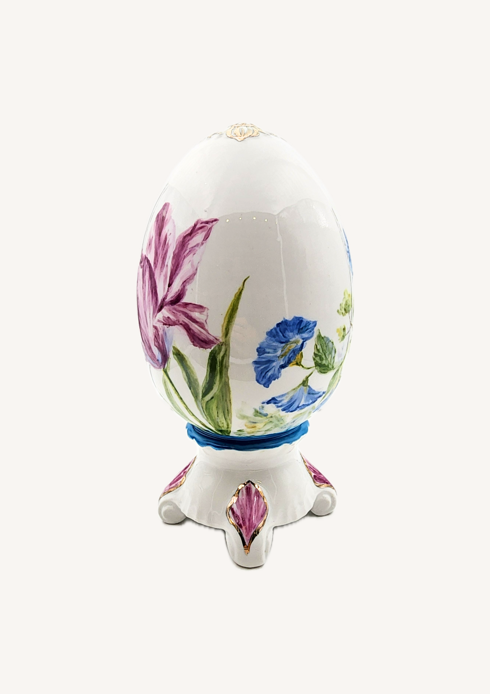 Пасхальная коллекция вдохновлена весной и её нежными цветами, которые наполняют дом праздничной атмосферой и уютом. Яйца украшены изысканной ручной росписью тюльпанов, полевых колокольчиков, вьюнков, одуванчиков, ирисов и ромашек, с тонким золочением для особого блеска. Эти уникальные изделия идеально дополнят сервировку праздничного стола или станут стильным акцентом в интерьере.