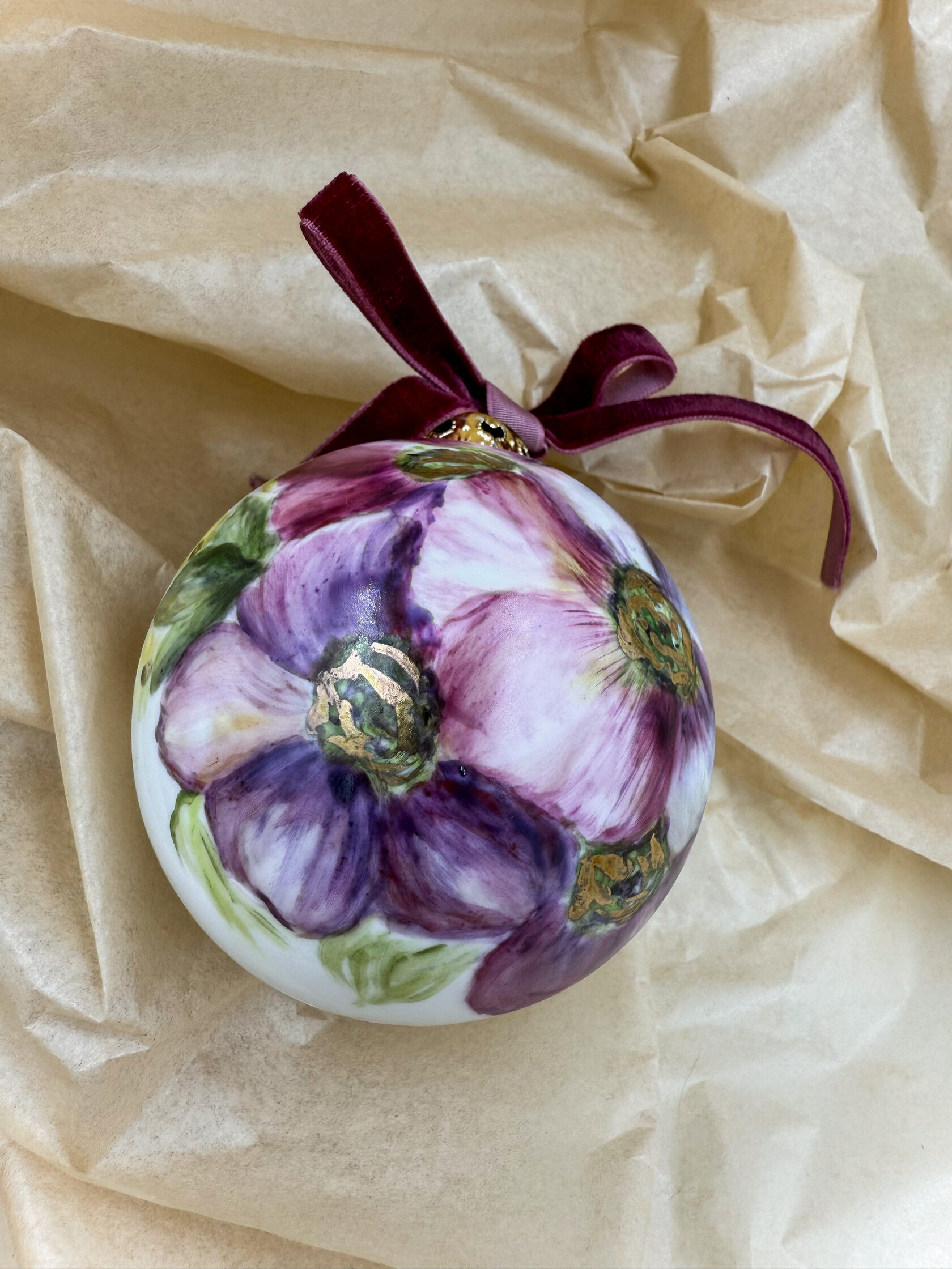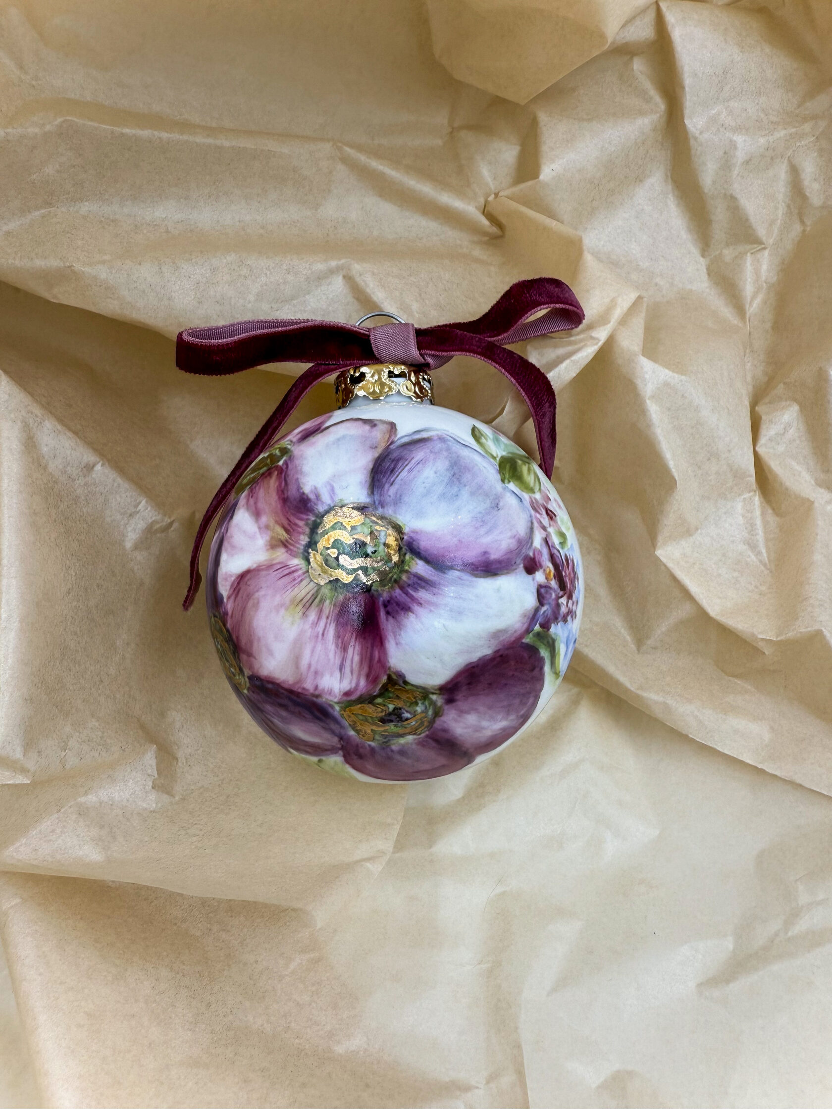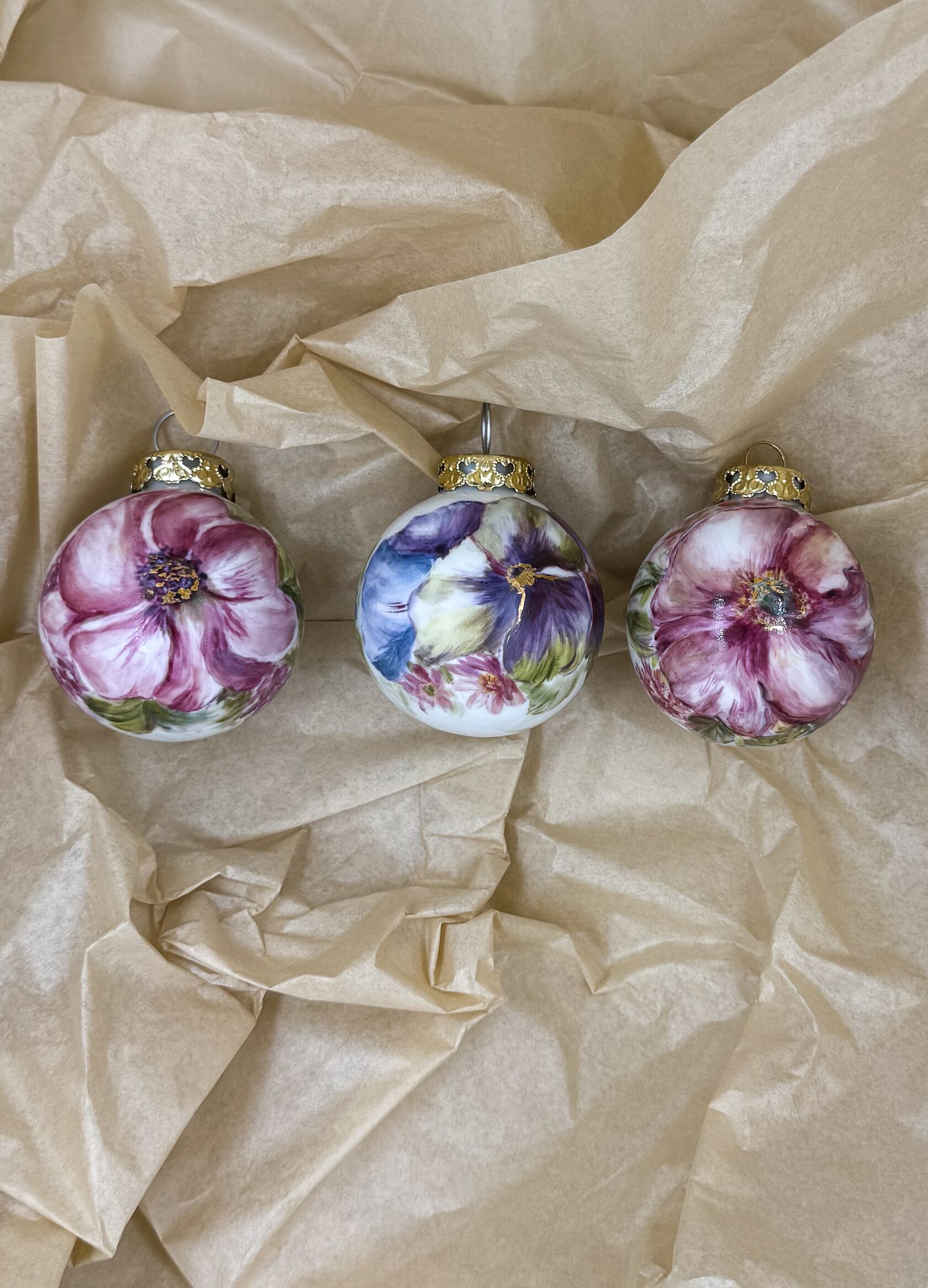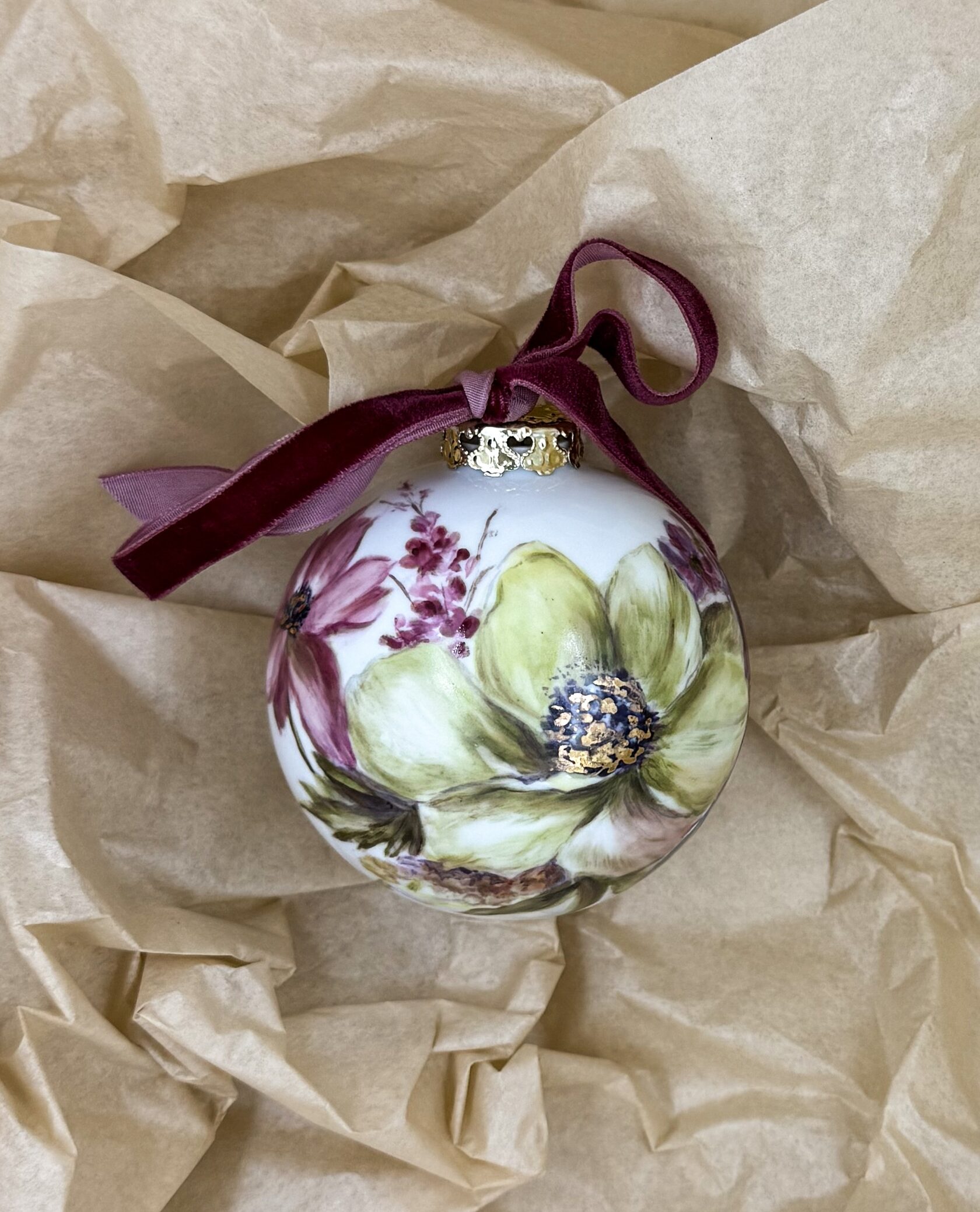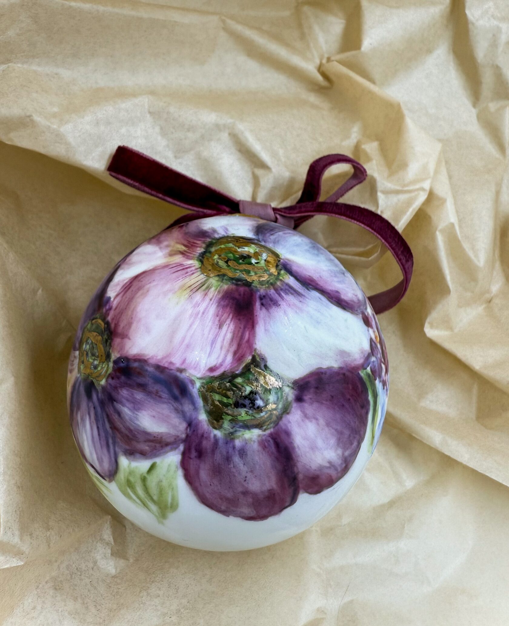 Каждый шар украшен авторской росписью с золочением. Такой шар может быть не только украшением новогодней елки, но и праздничных интерьерных композиций, создавая атмосферу эстетики и праздничного настроения. Шары отлиты на фарфоровых мануфактурах Франции и Германии.