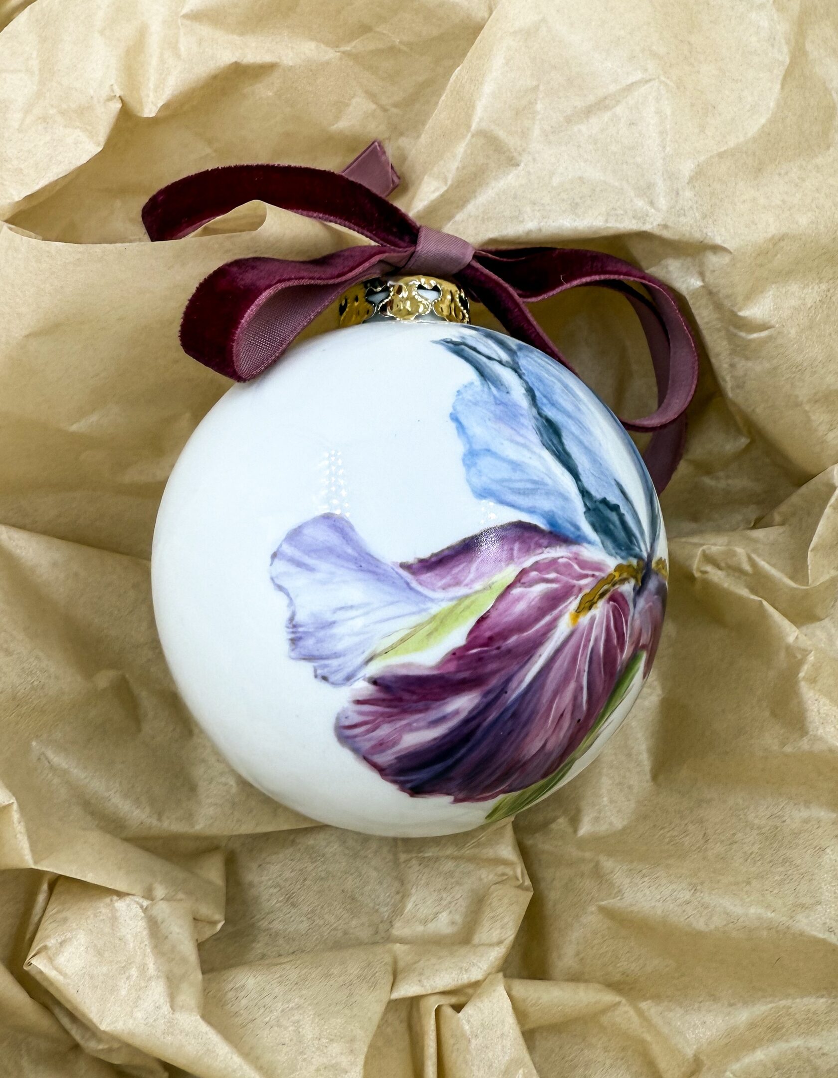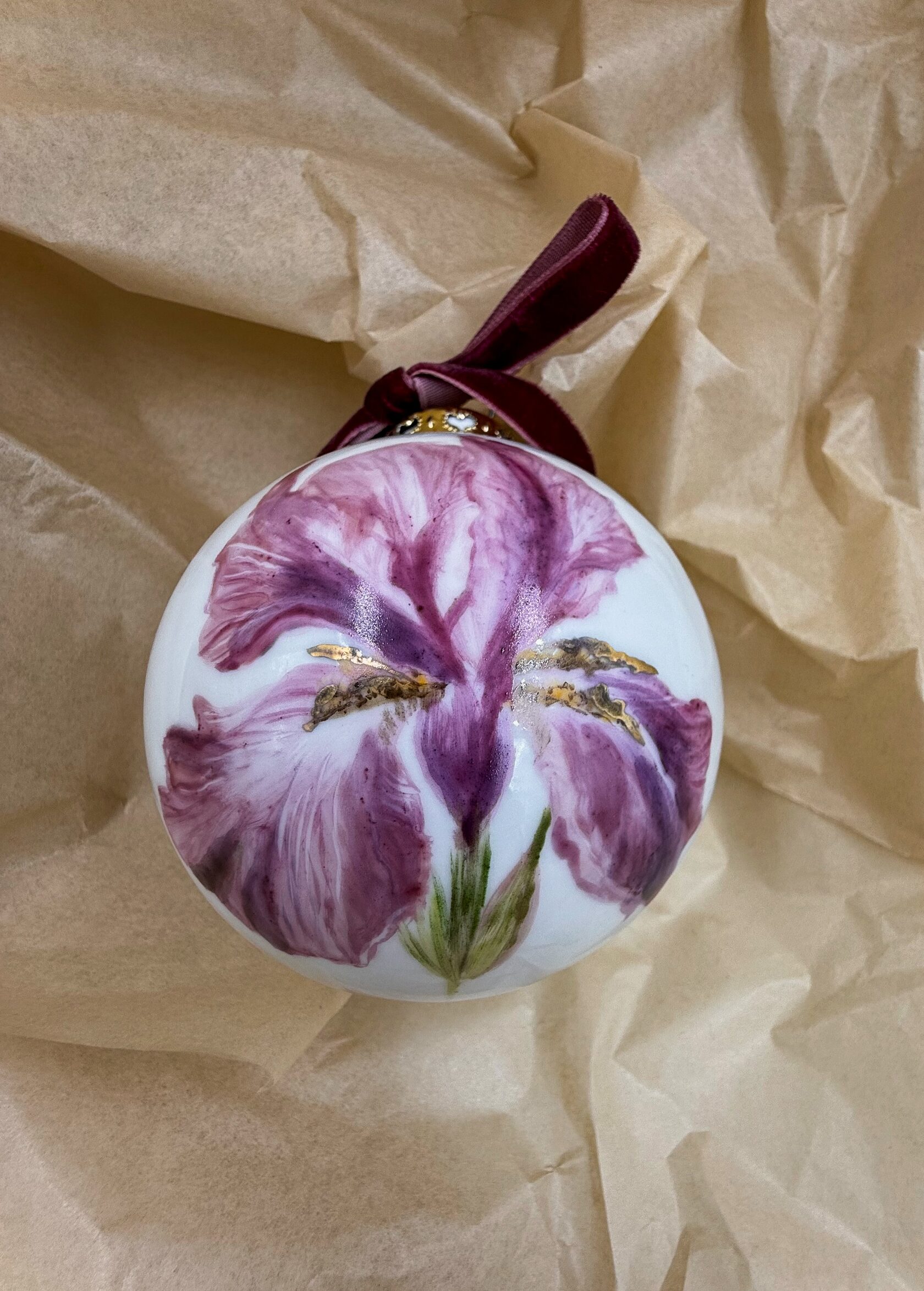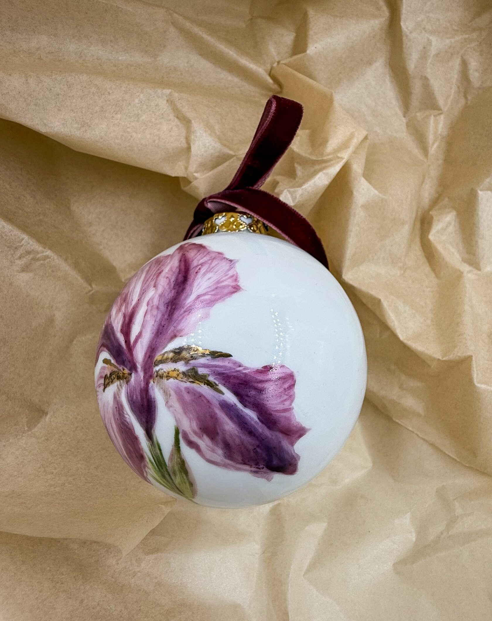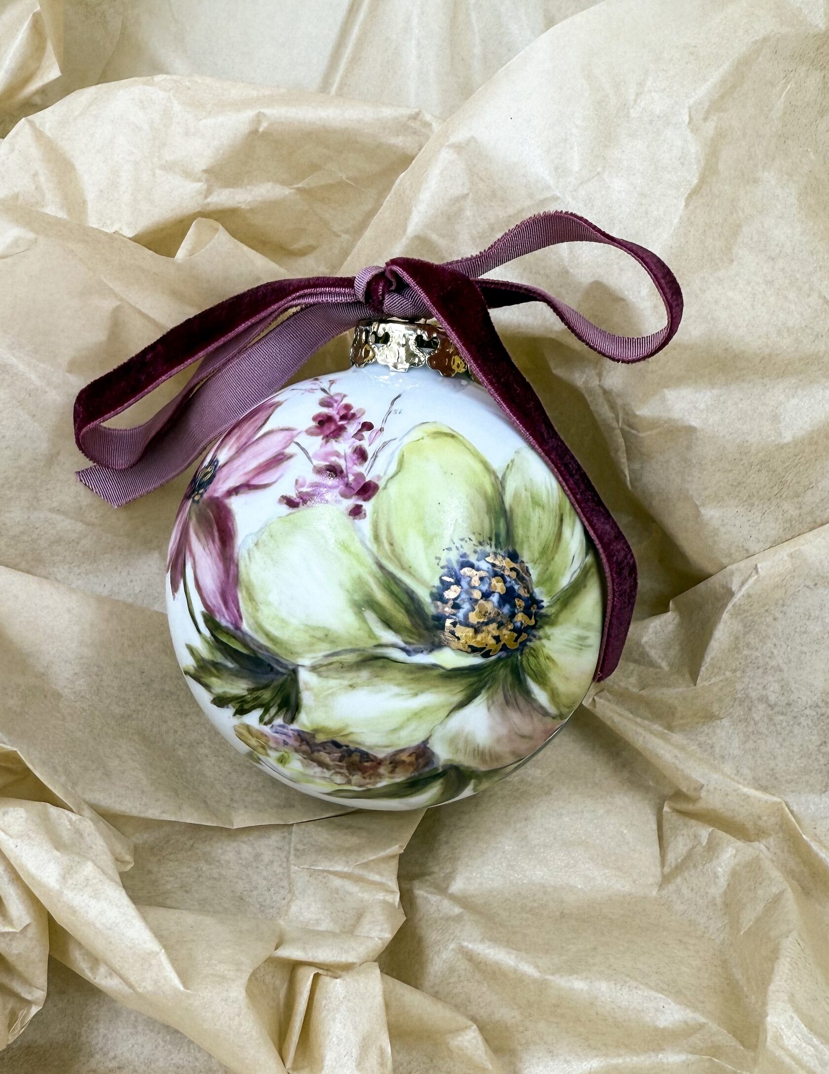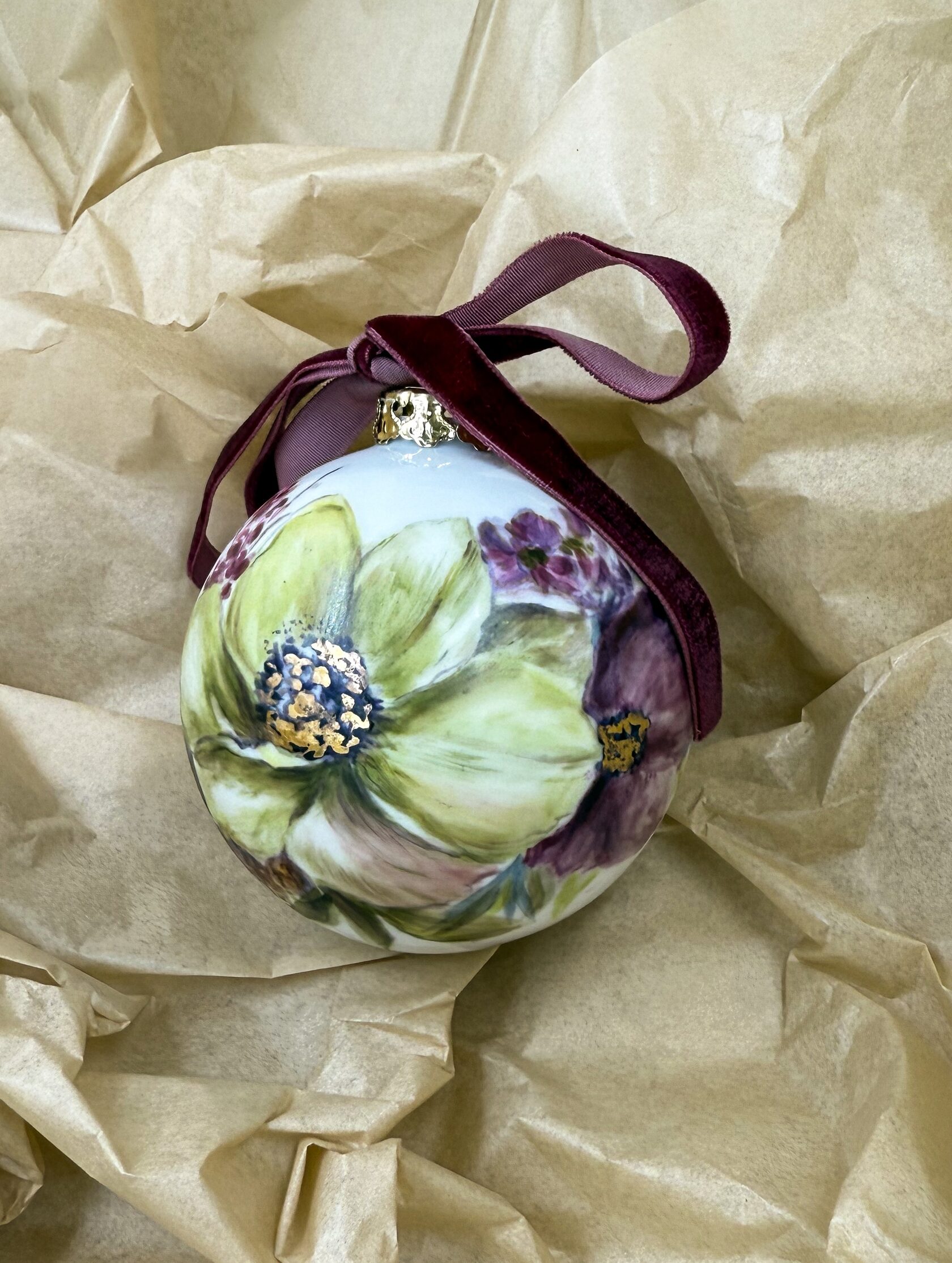 Каждый шар украшен авторской росписью с золочением. Такой шар может быть не только украшением новогодней елки, но и праздничных интерьерных композиций, создавая атмосферу эстетики и праздничного настроения. Шары отлиты на фарфоровых мануфактурах Франции и Германии.