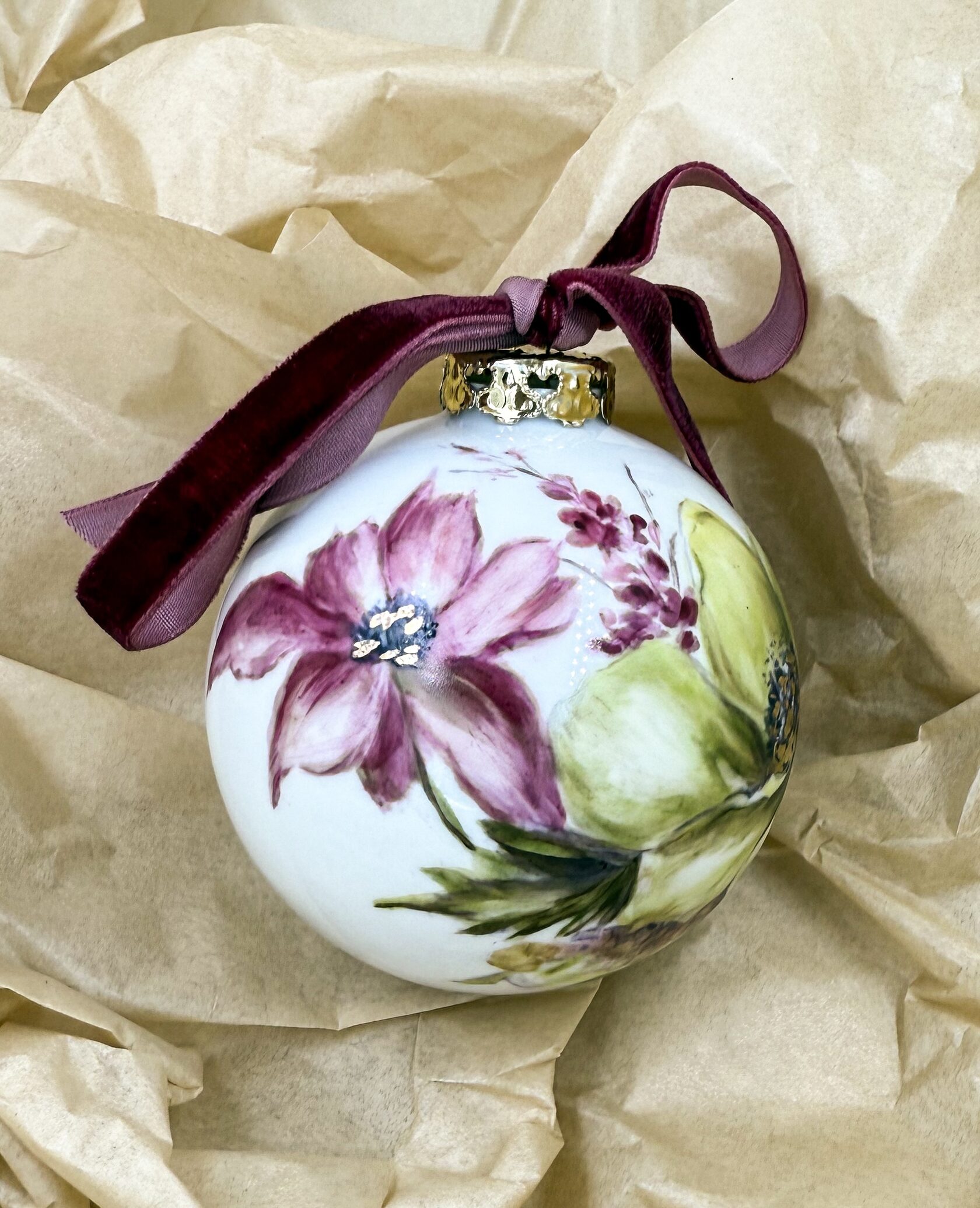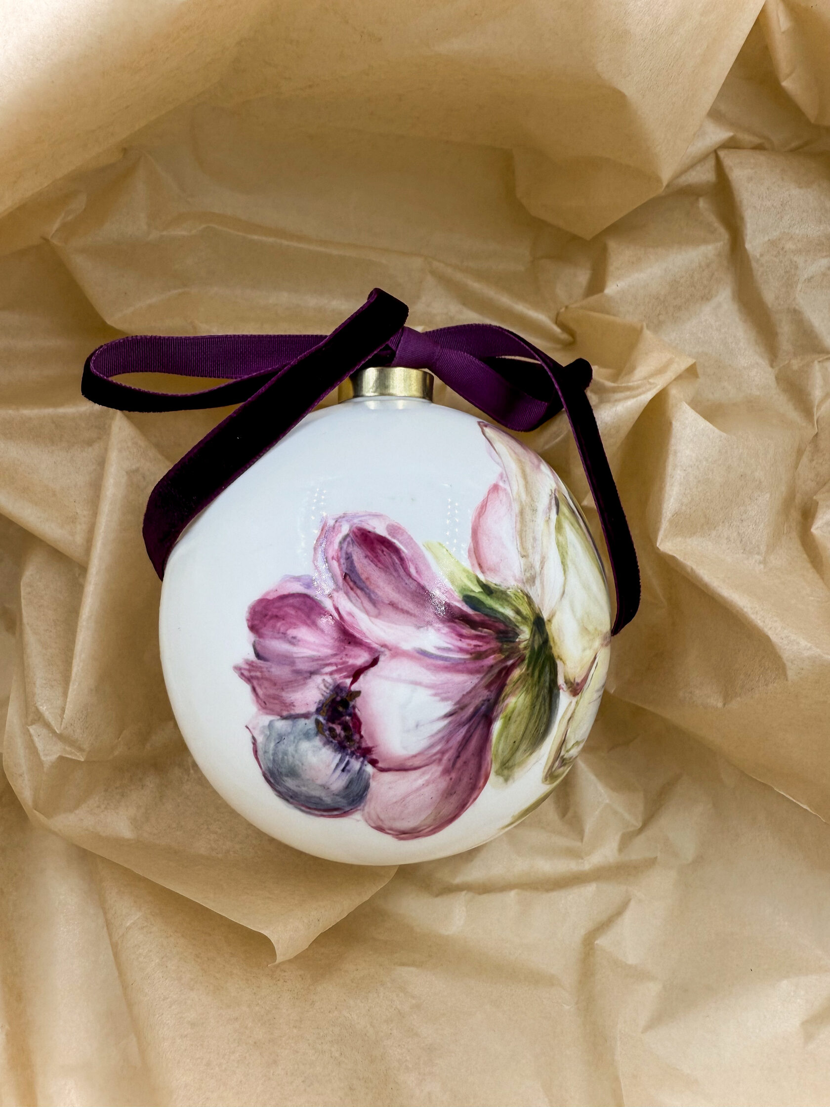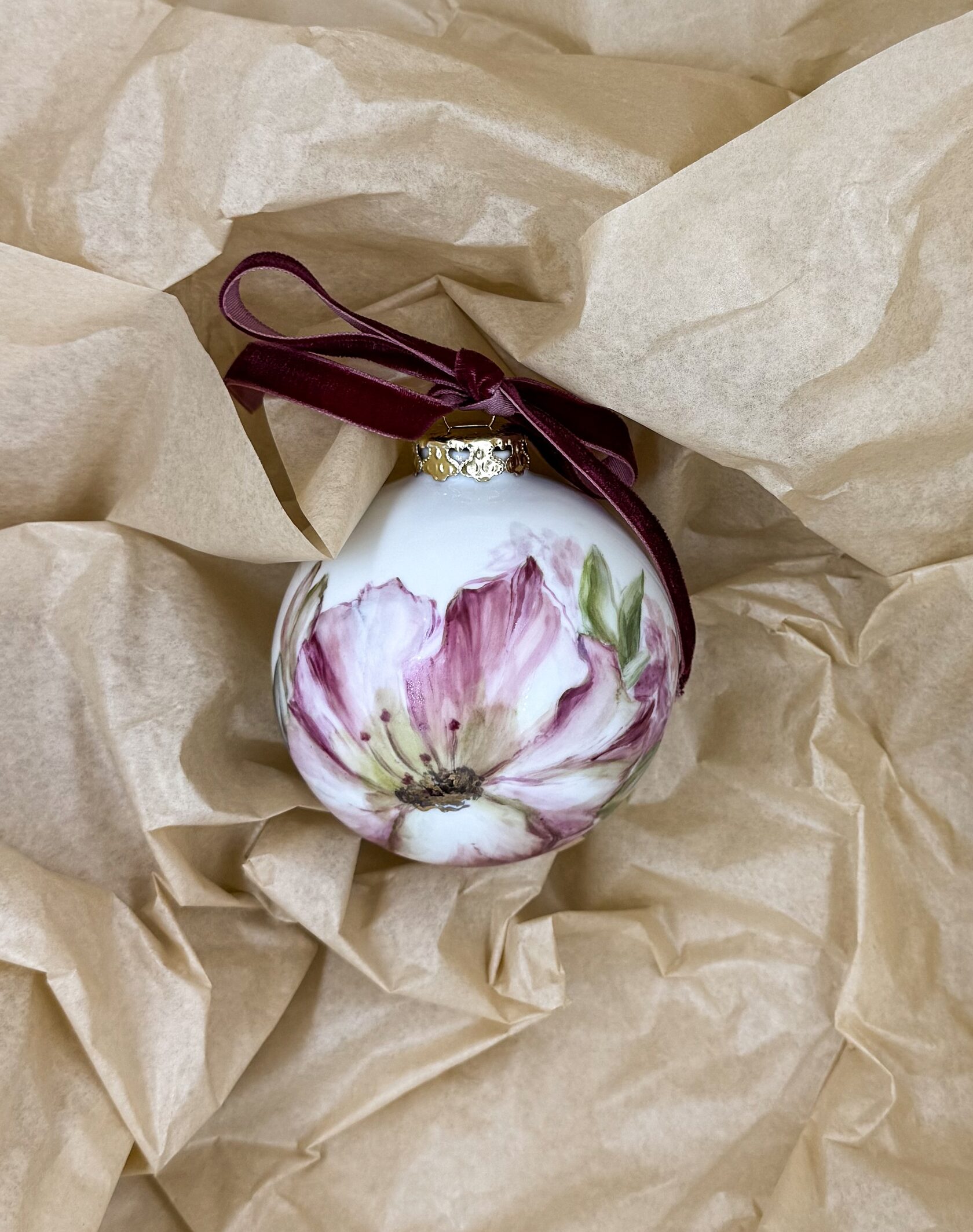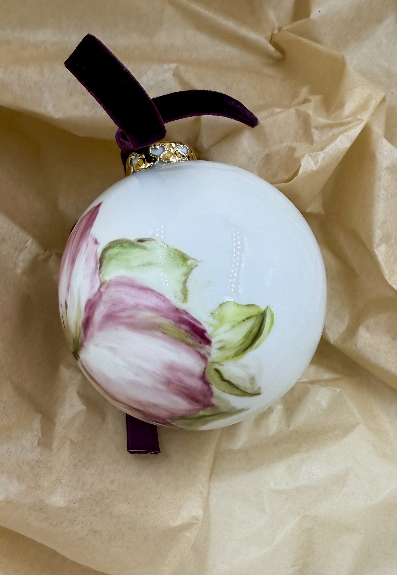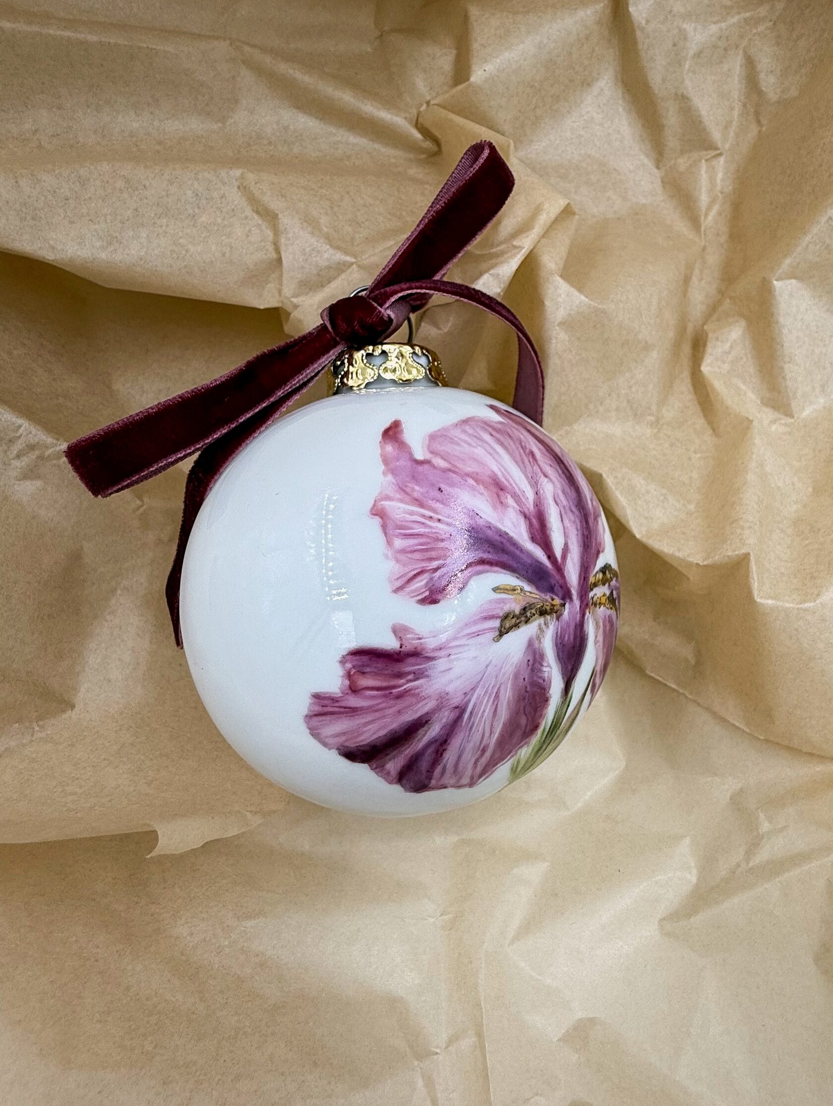 Каждый шар украшен авторской росписью с золочением. Такой шар может быть не только украшением новогодней елки, но и праздничных интерьерных композиций, создавая атмосферу эстетики и праздничного настроения. Шары отлиты на фарфоровых мануфактурах Франции и Германии.