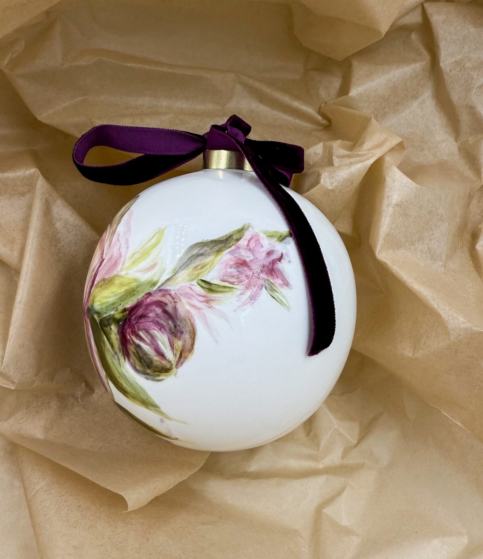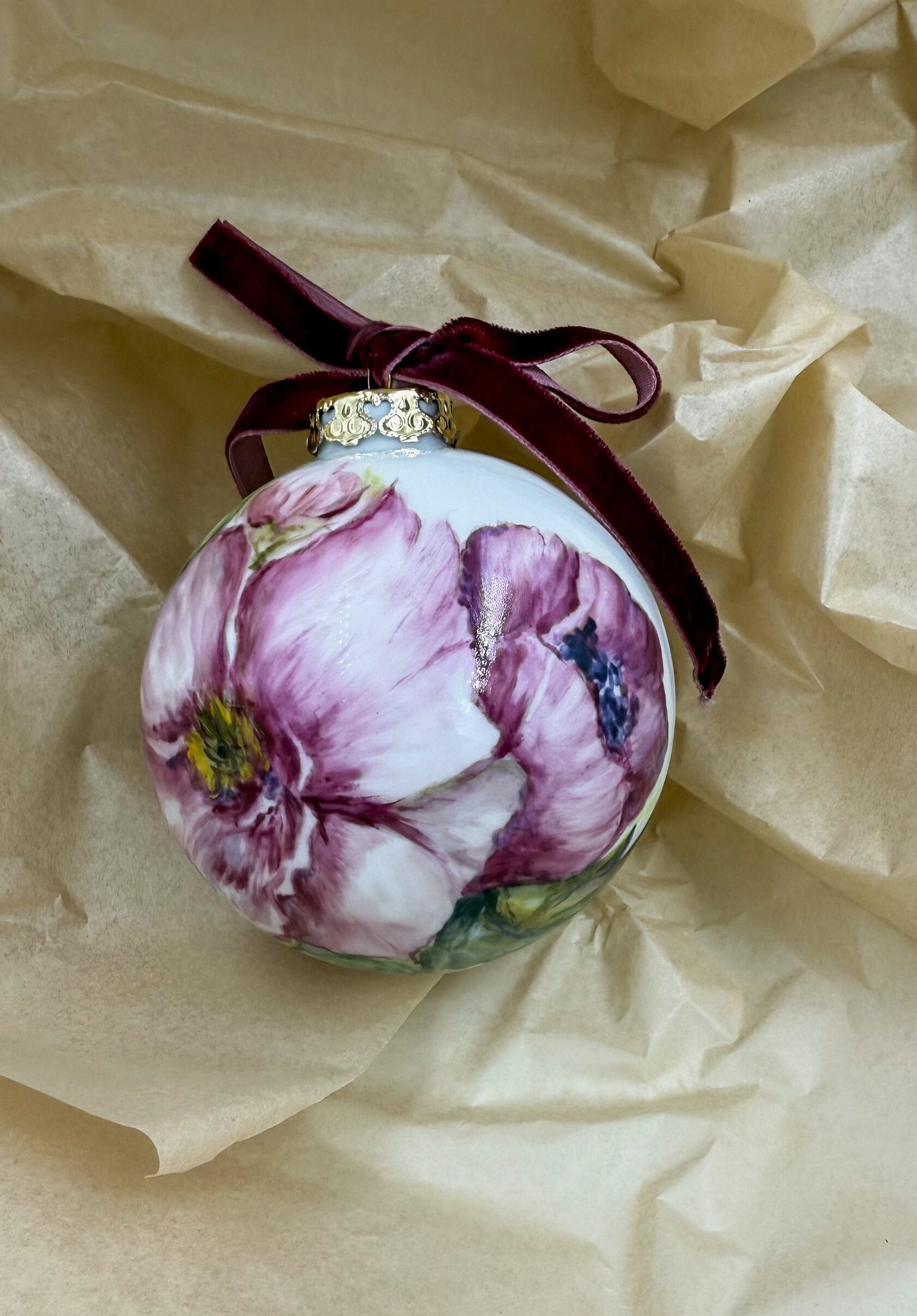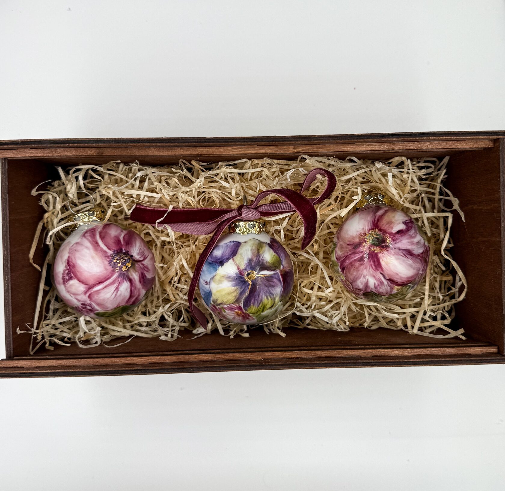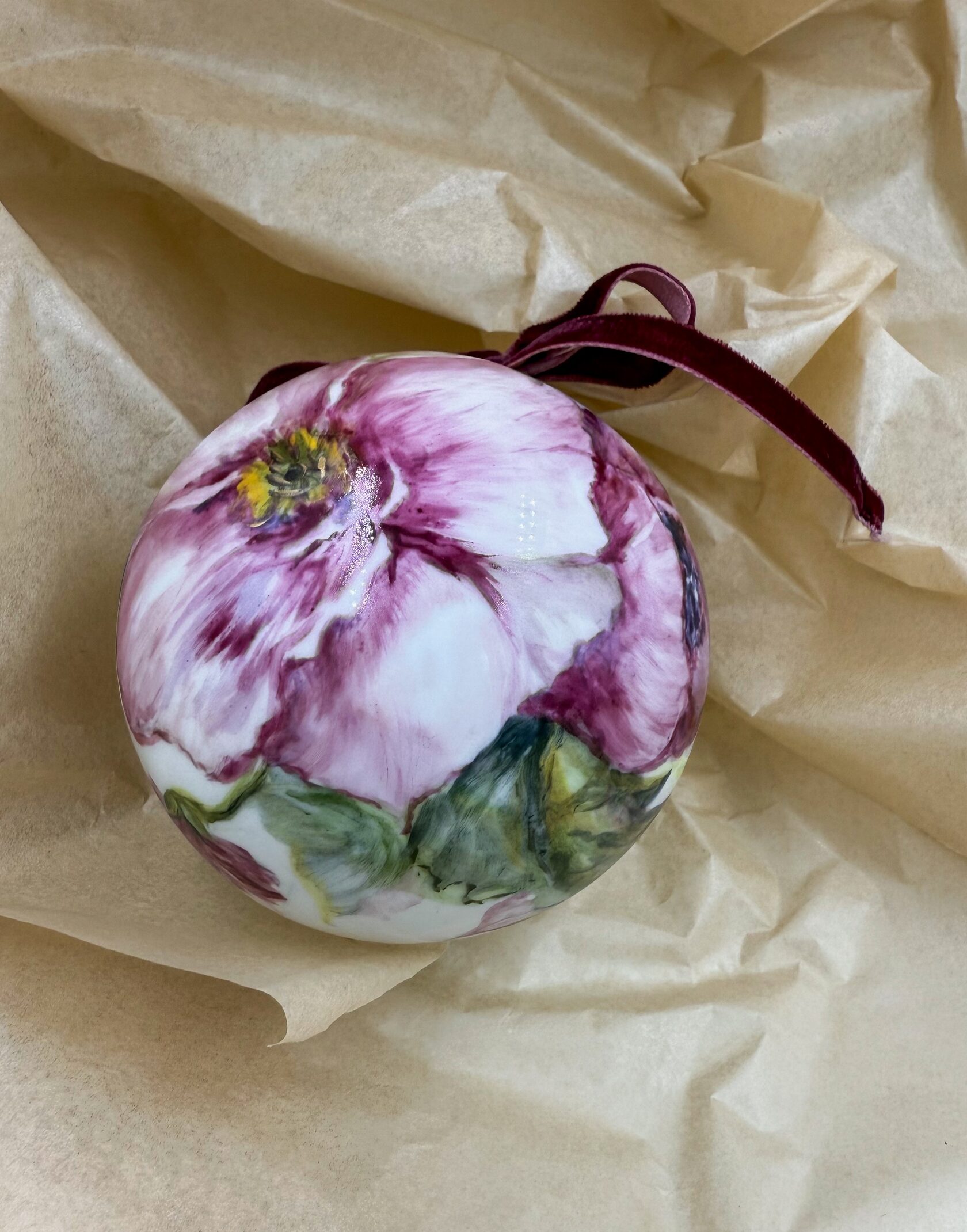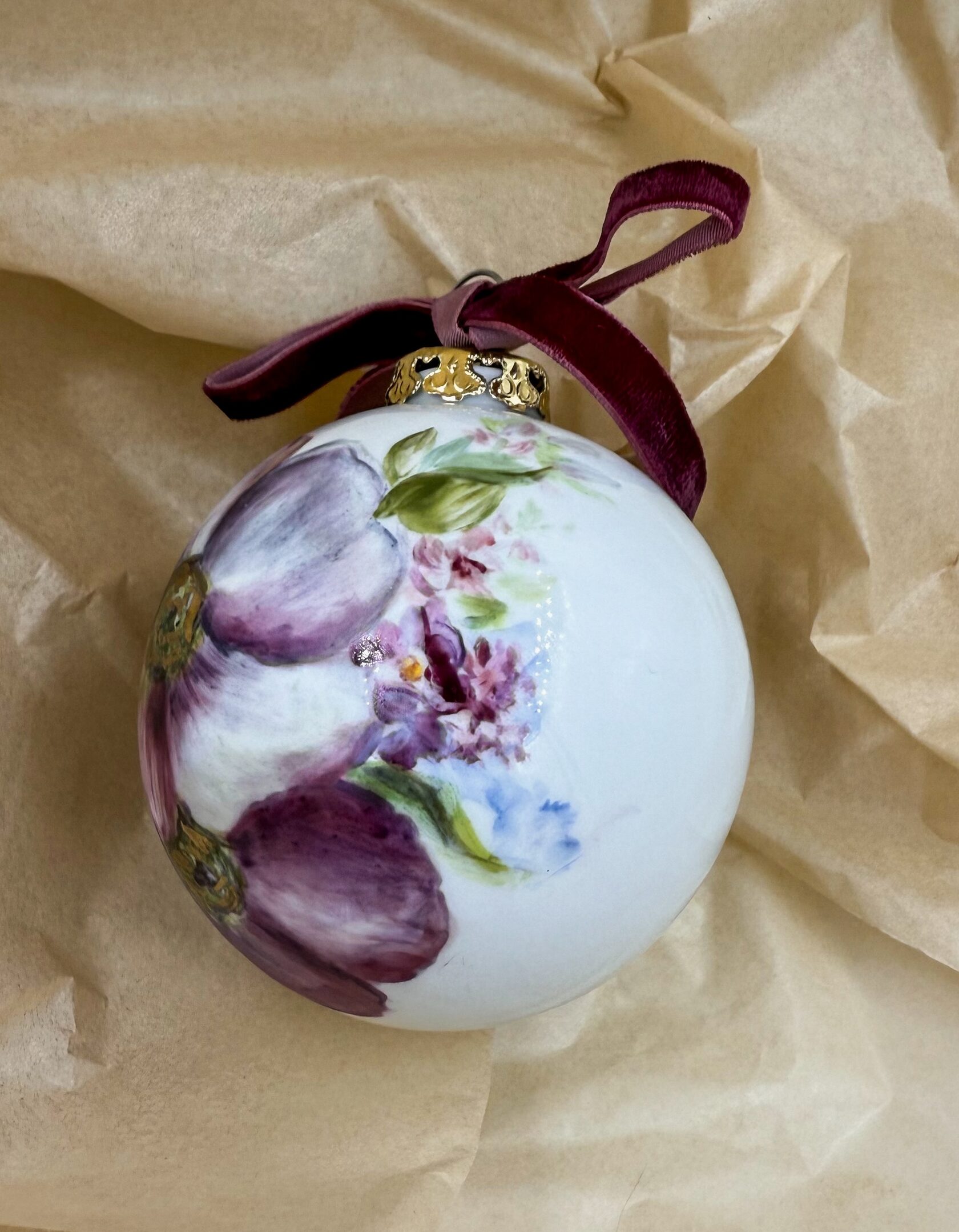 Каждый шар украшен авторской росписью с золочением. Такой шар может быть не только украшением новогодней елки, но и праздничных интерьерных композиций, создавая атмосферу эстетики и праздничного настроения. Шары отлиты на фарфоровых мануфактурах Франции и Германии.