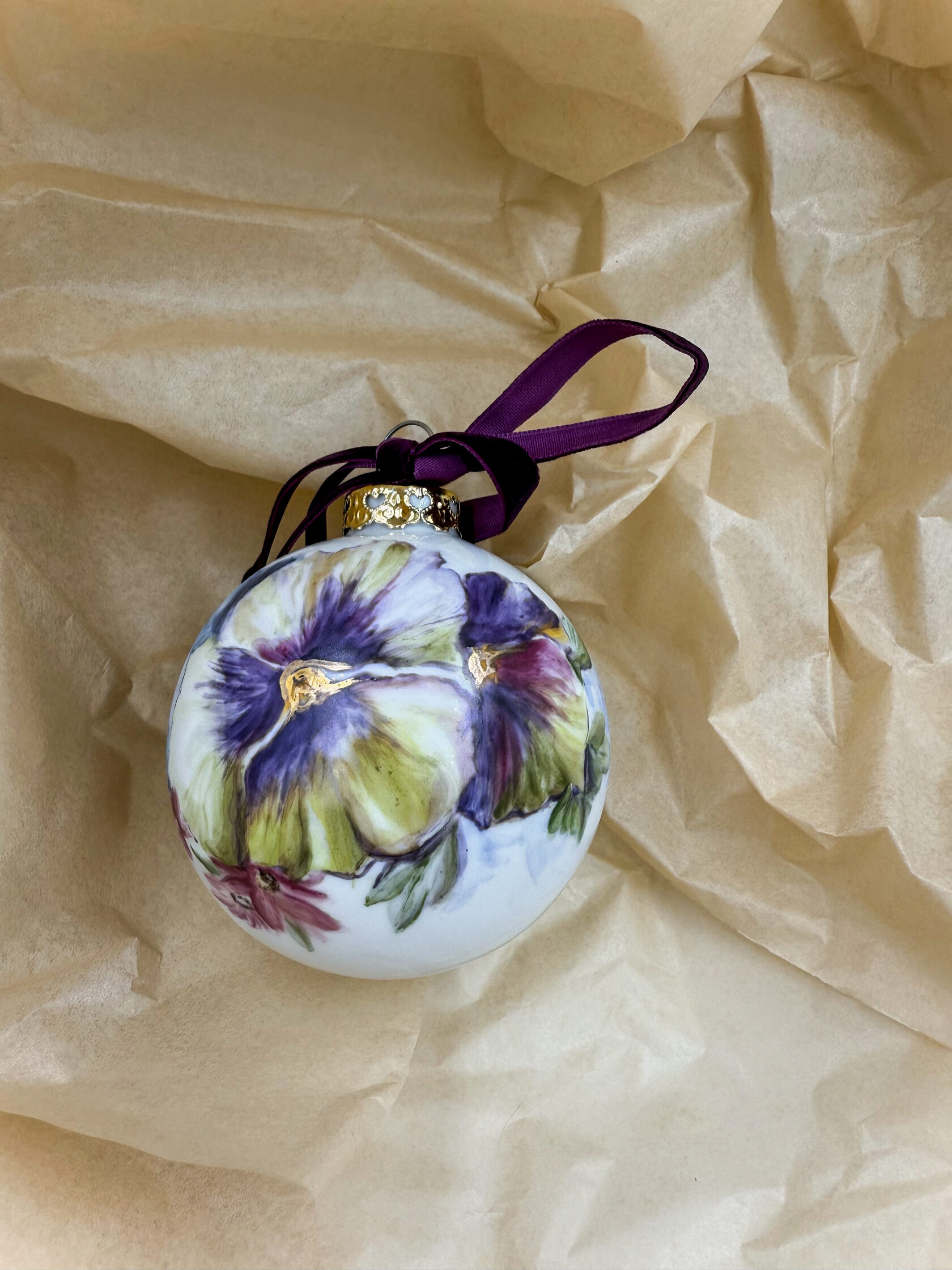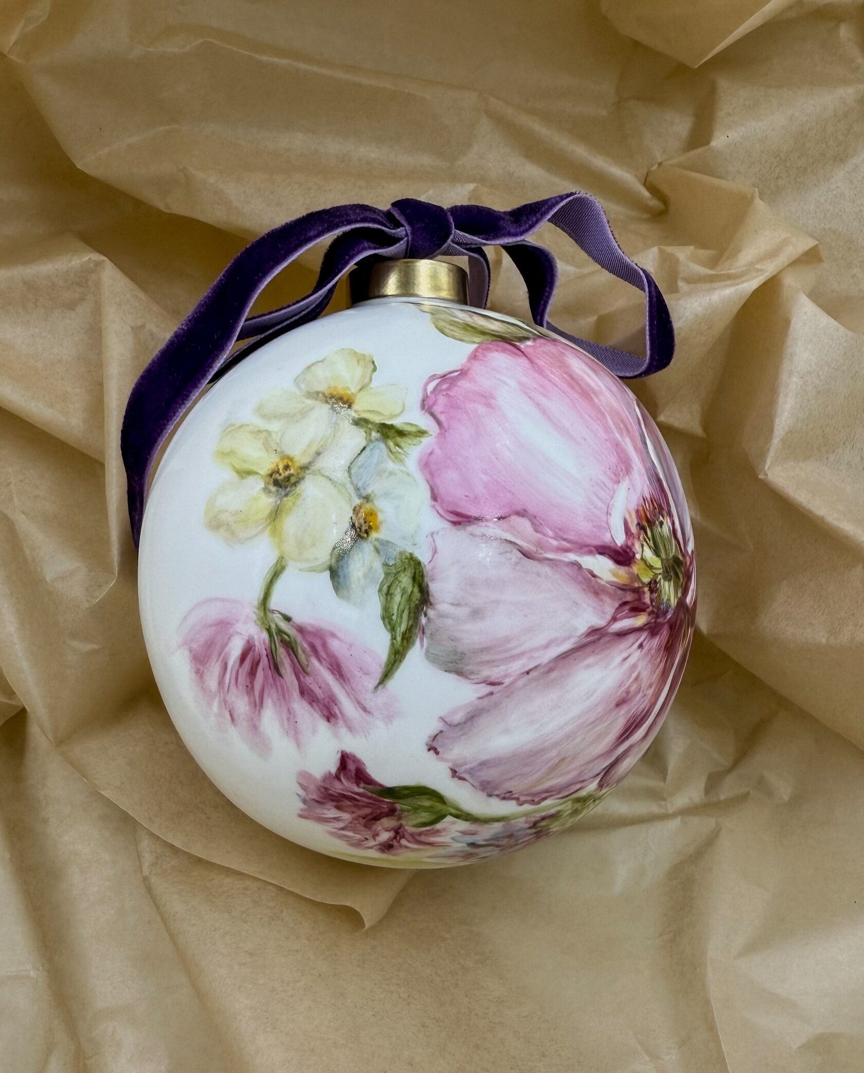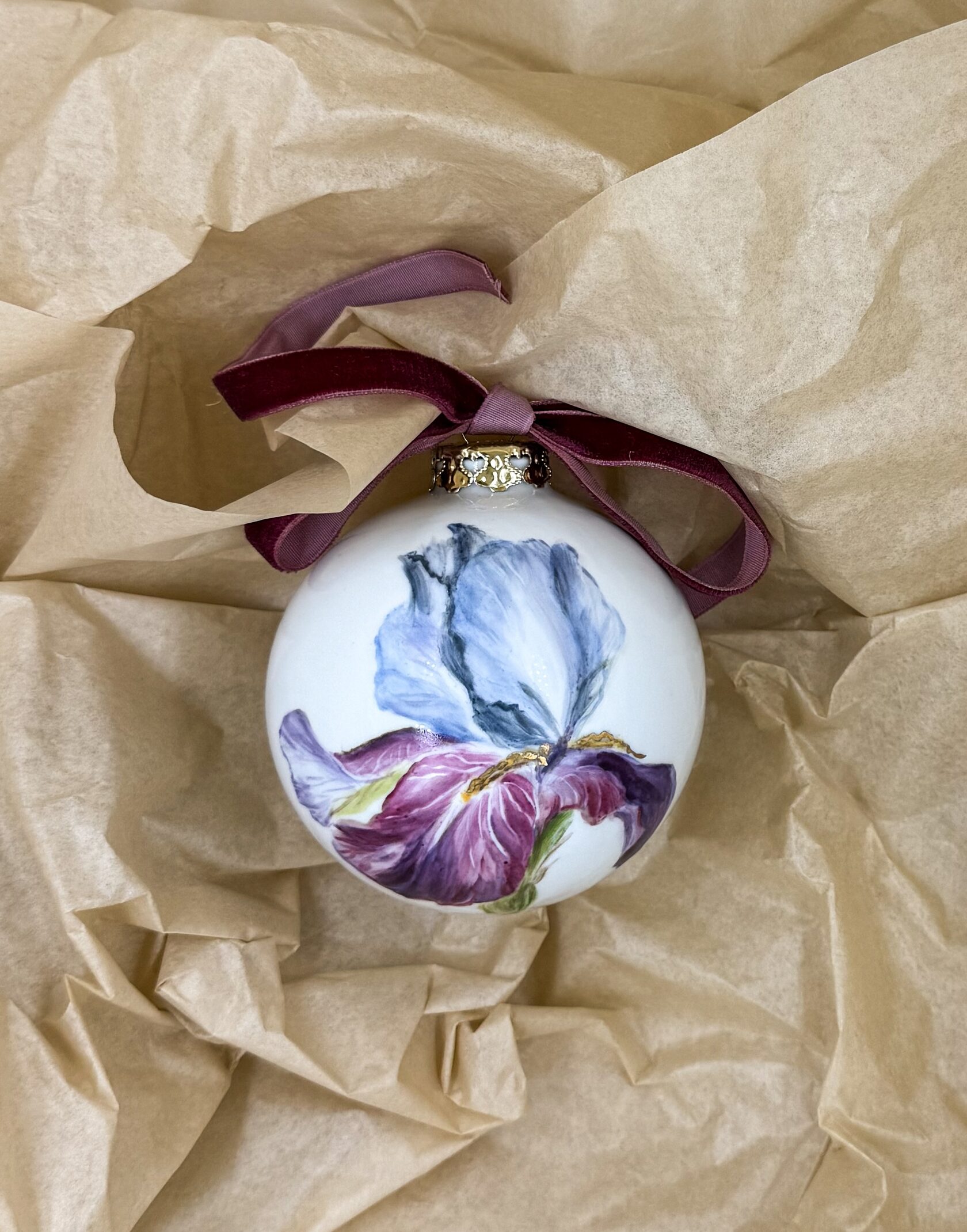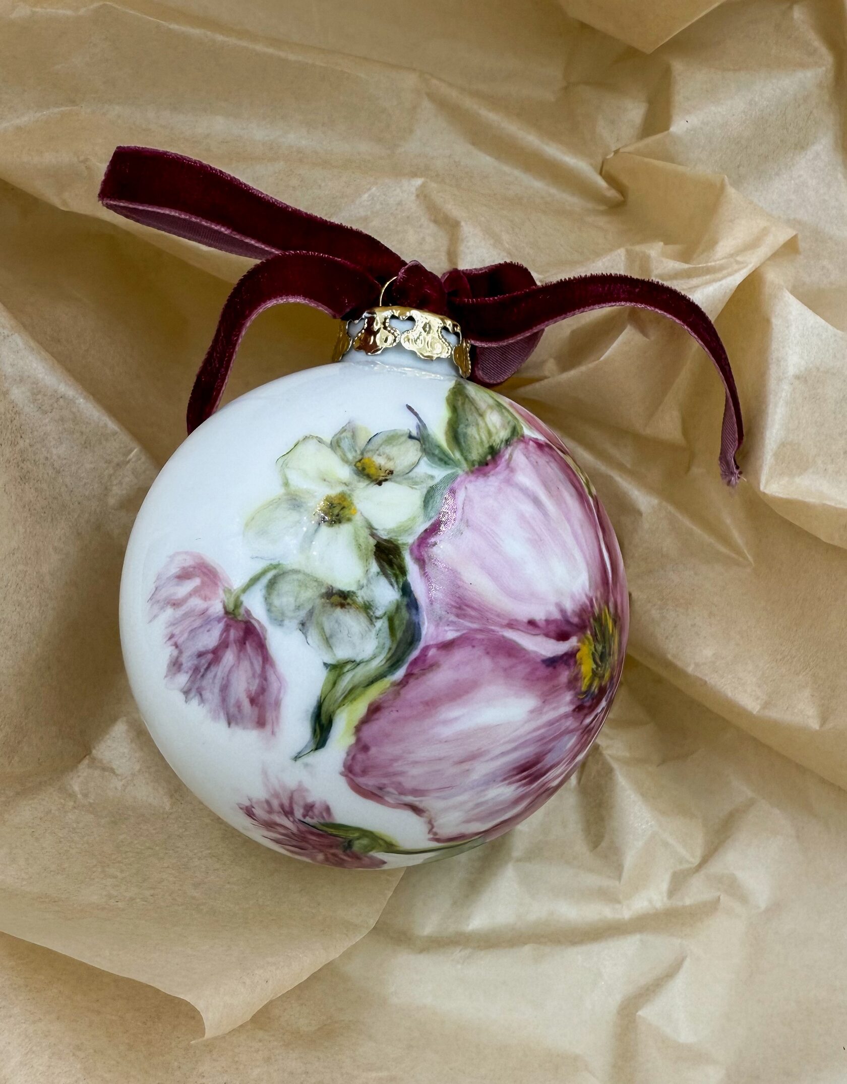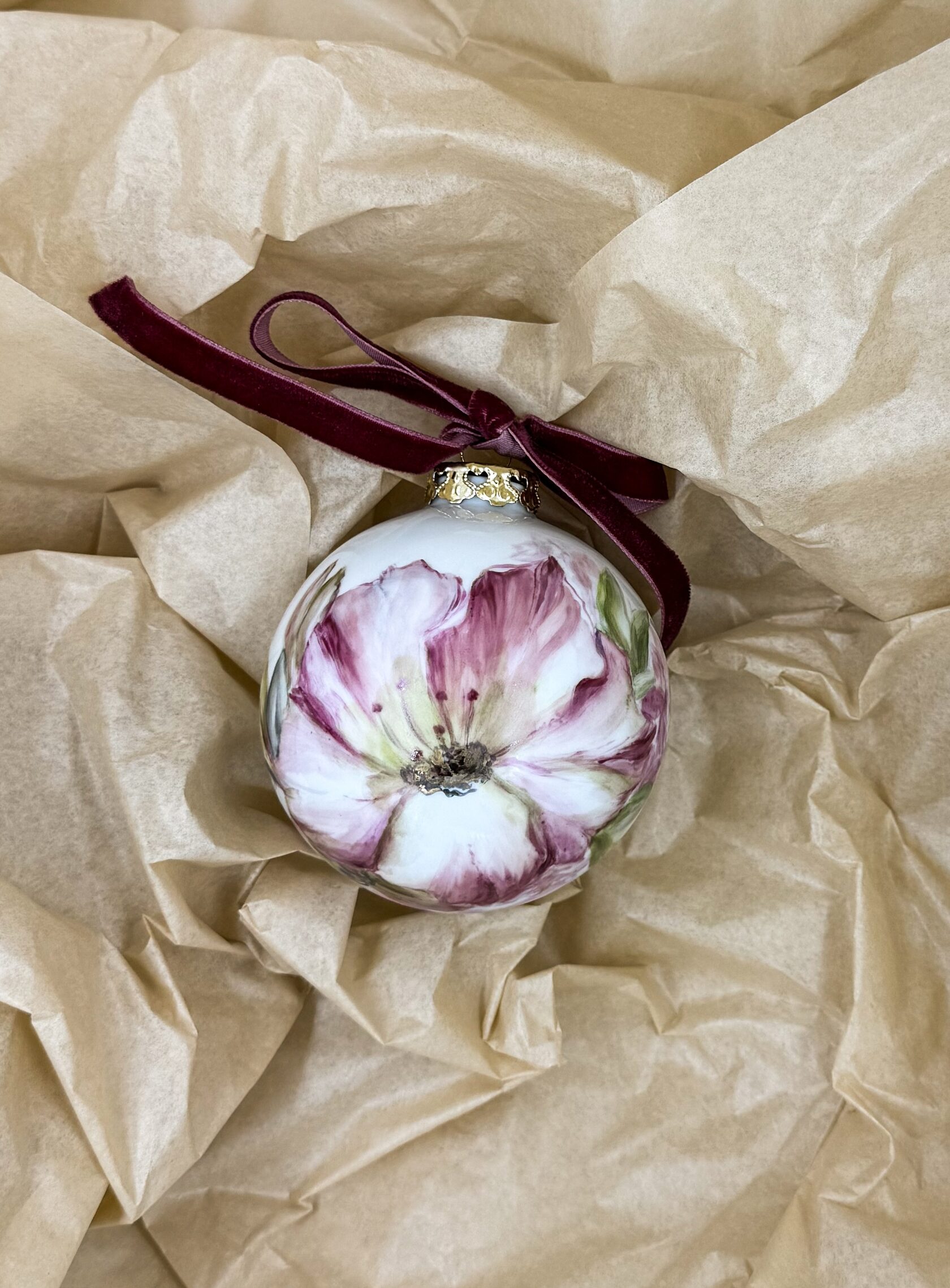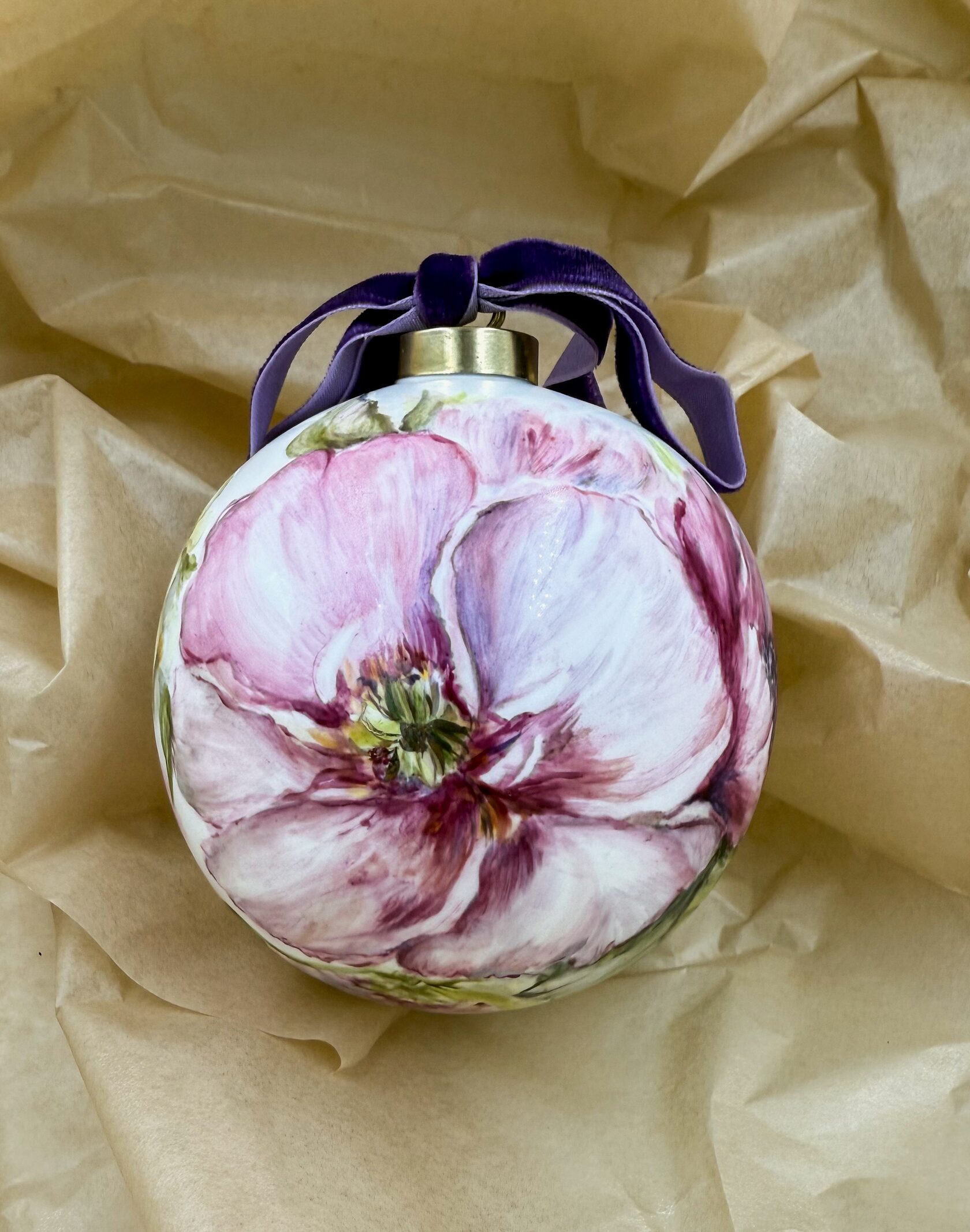 Каждый шар украшен авторской росписью с золочением. Такой шар может быть не только украшением новогодней елки, но и праздничных интерьерных композиций, создавая атмосферу эстетики и праздничного настроения. Шары отлиты на фарфоровых мануфактурах Франции и Германии.