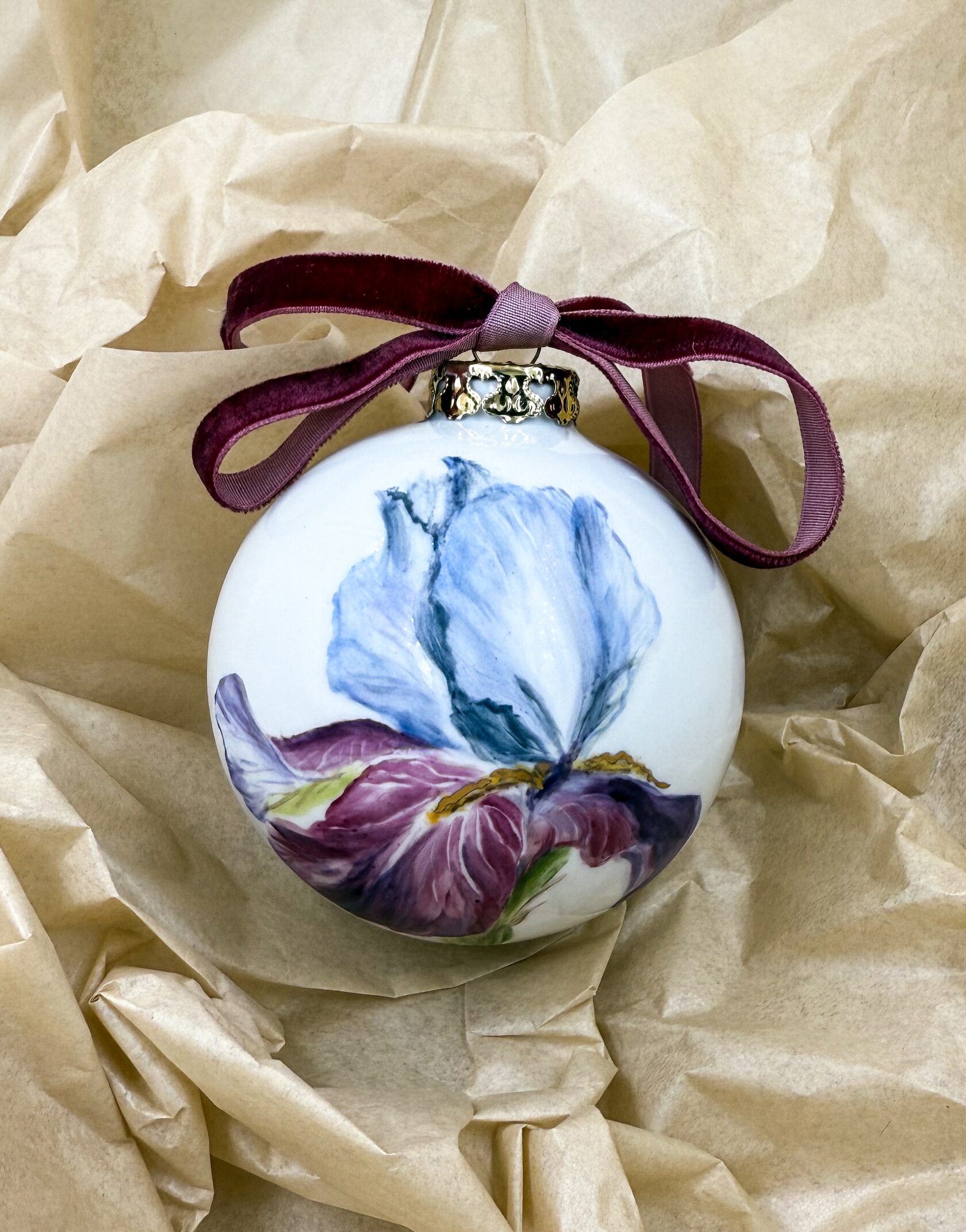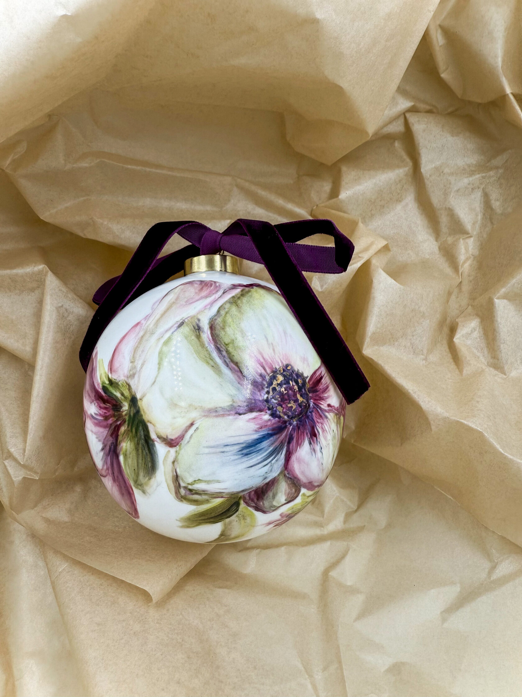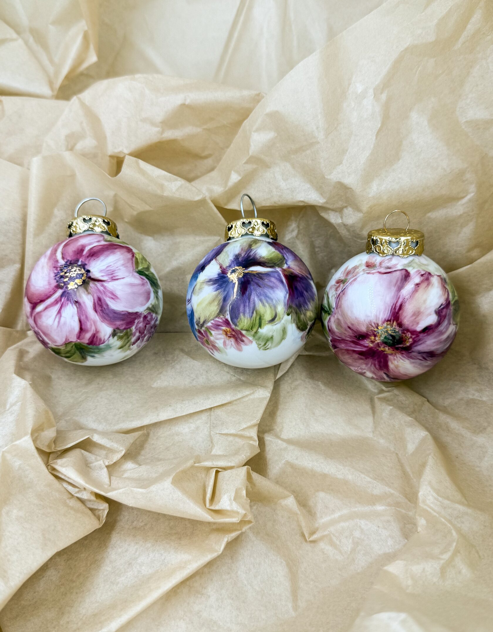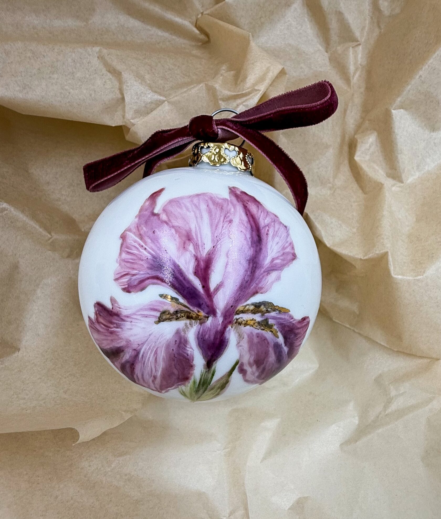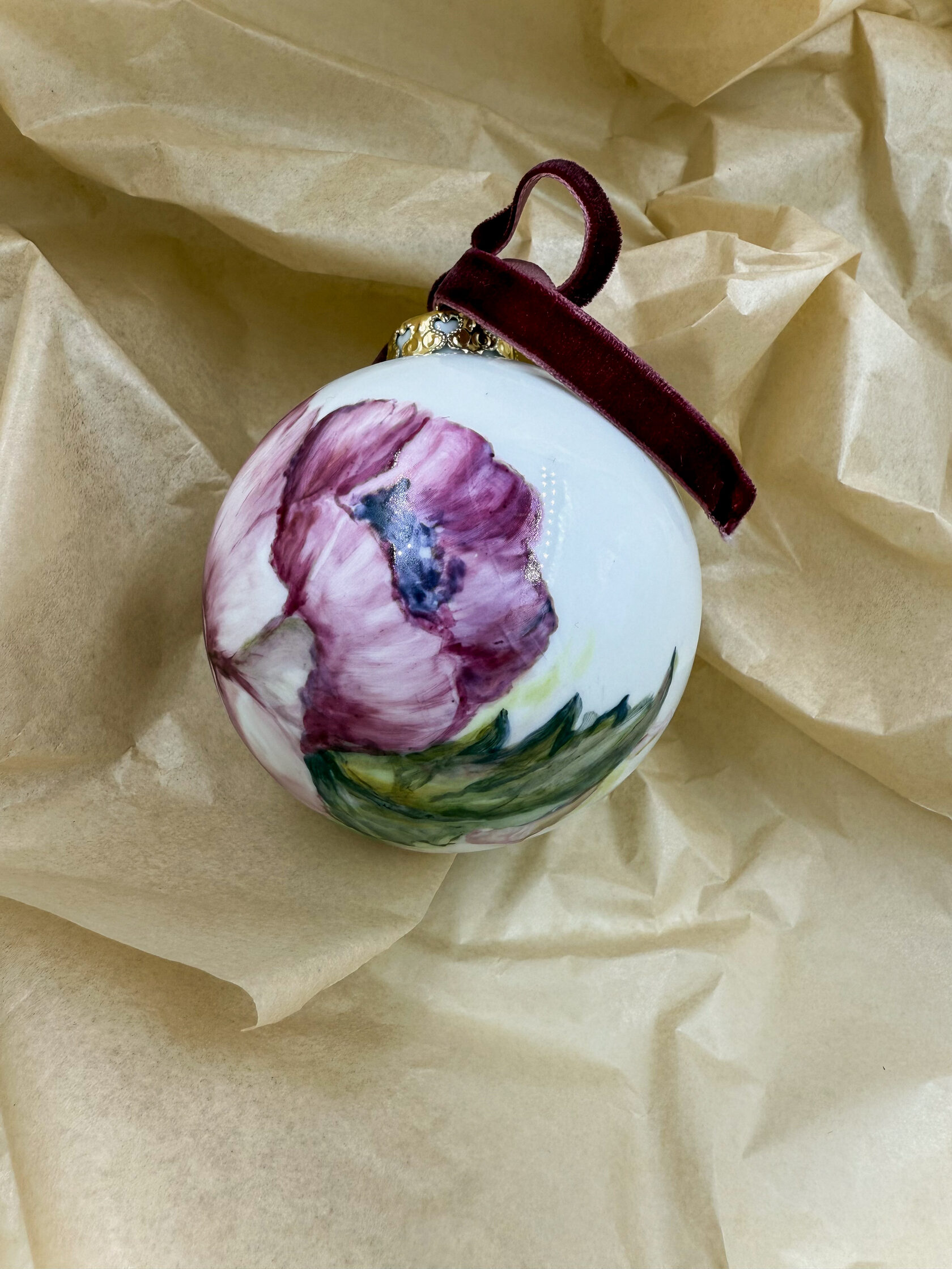 Каждый шар украшен авторской росписью с золочением. Такой шар может быть не только украшением новогодней елки, но и праздничных интерьерных композиций, создавая атмосферу эстетики и праздничного настроения. Шары отлиты на фарфоровых мануфактурах Франции и Германии.