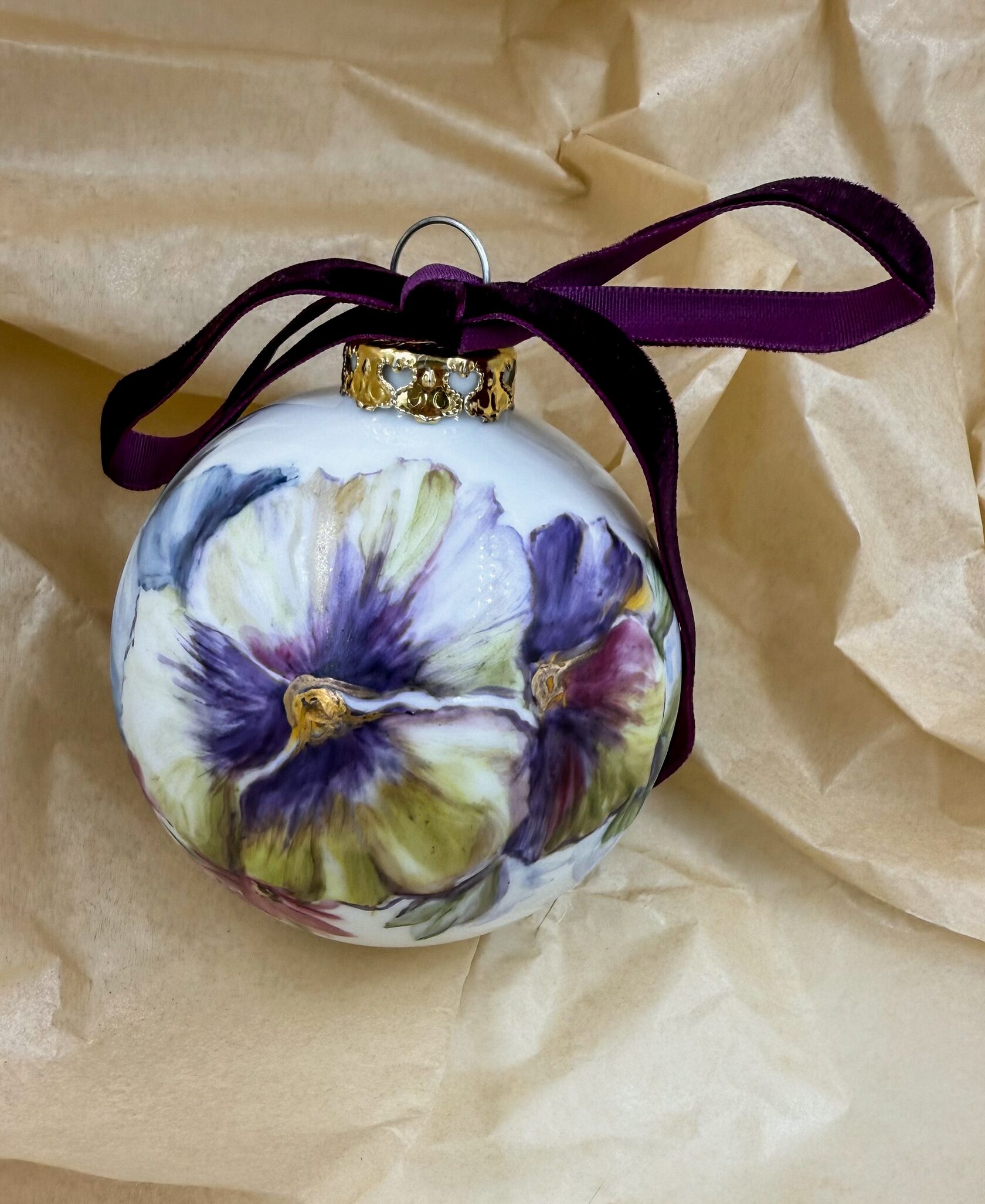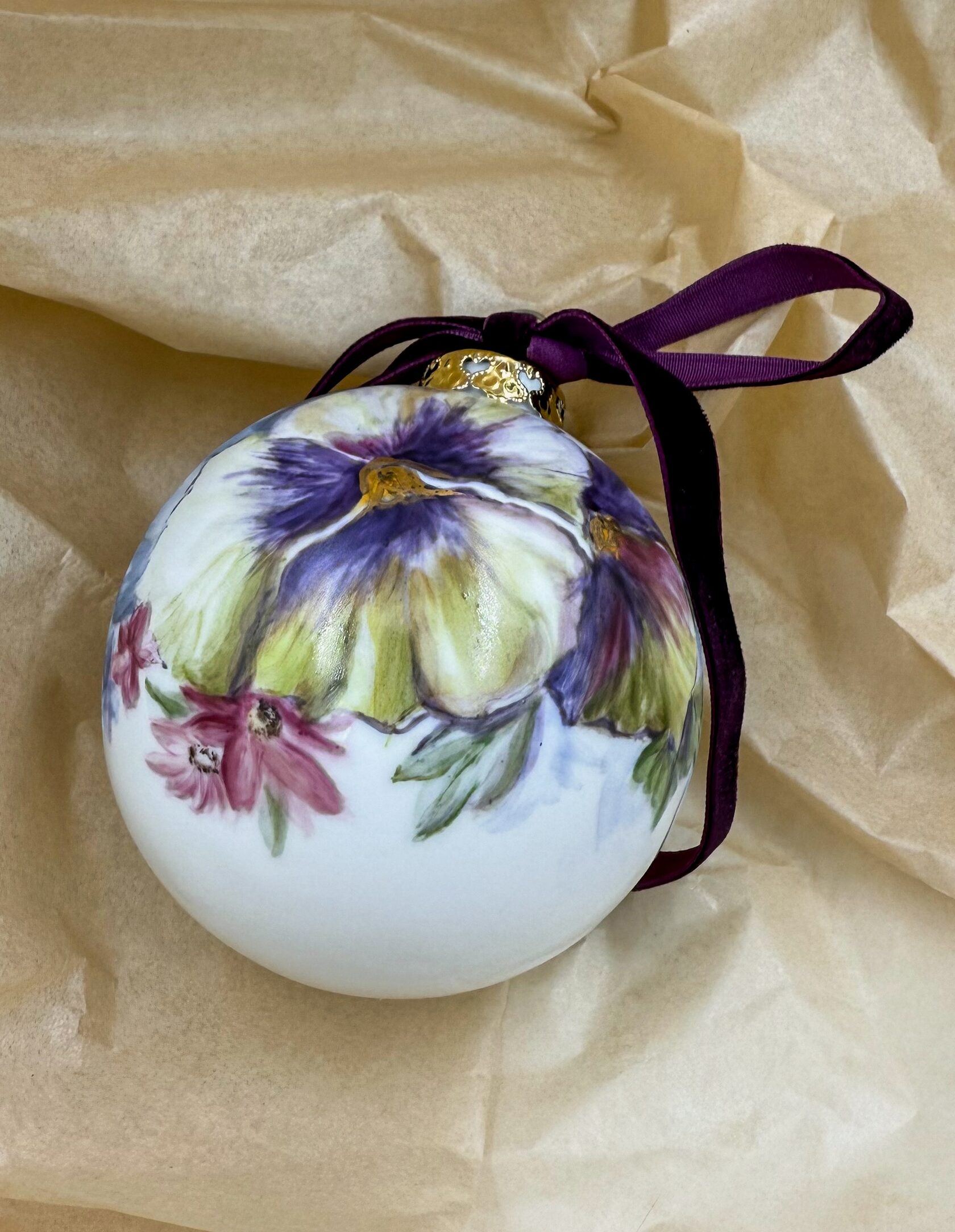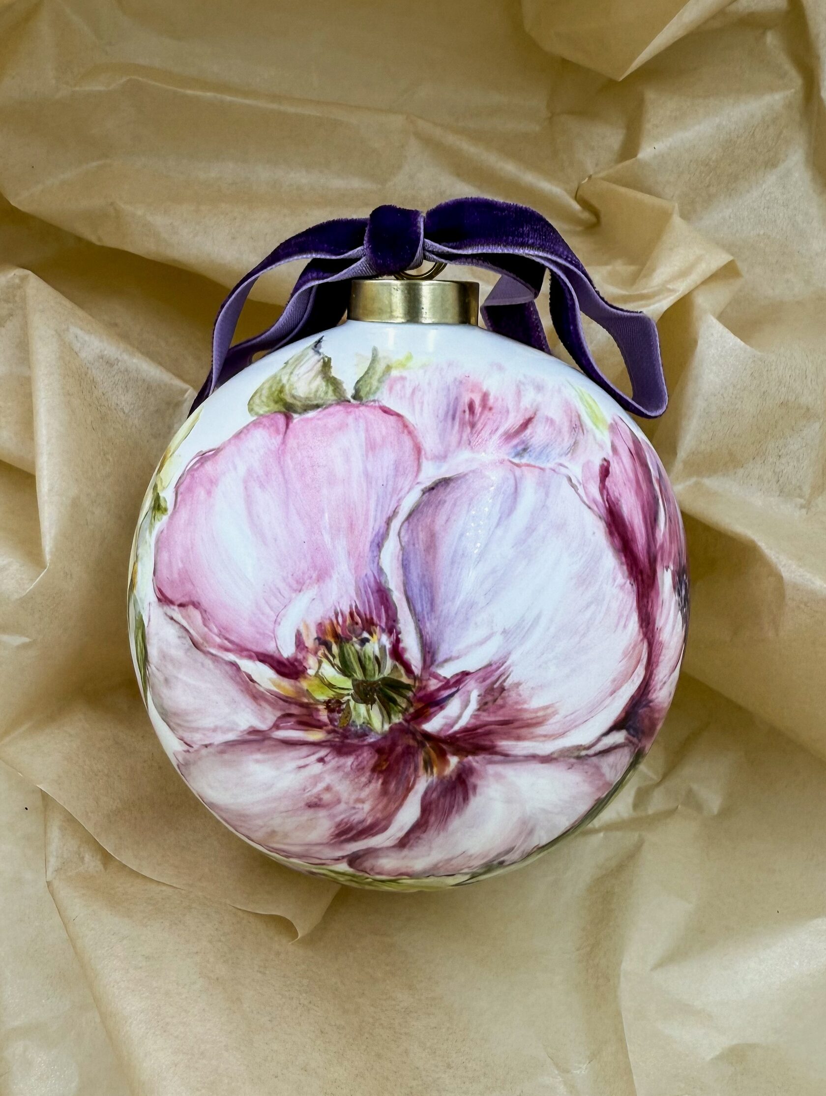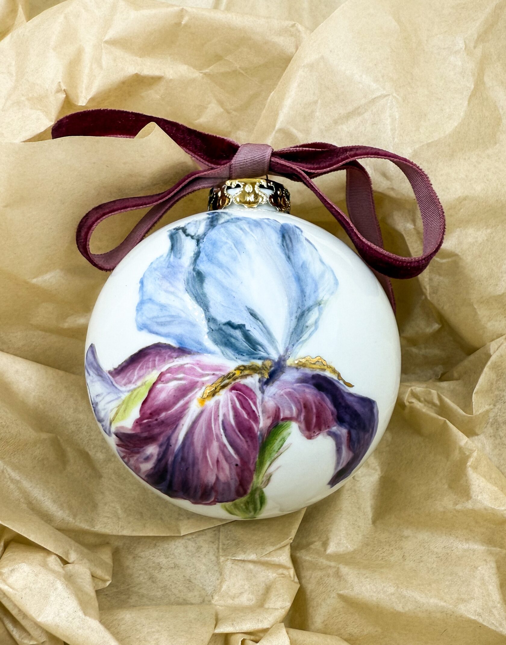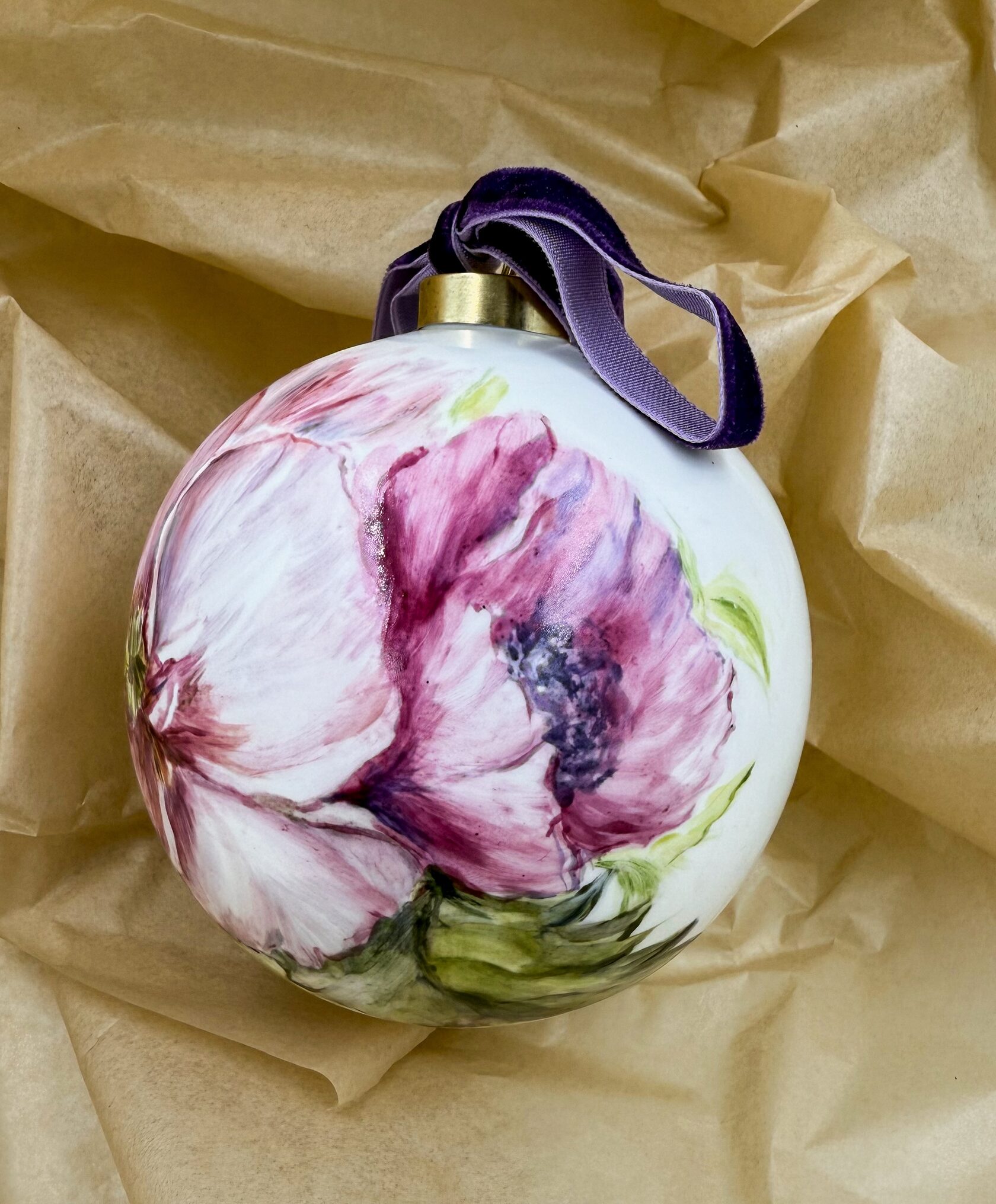 Каждый шар украшен авторской росписью с золочением. Такой шар может быть не только украшением новогодней елки, но и праздничных интерьерных композиций, создавая атмосферу эстетики и праздничного настроения. Шары отлиты на фарфоровых мануфактурах Франции и Германии.