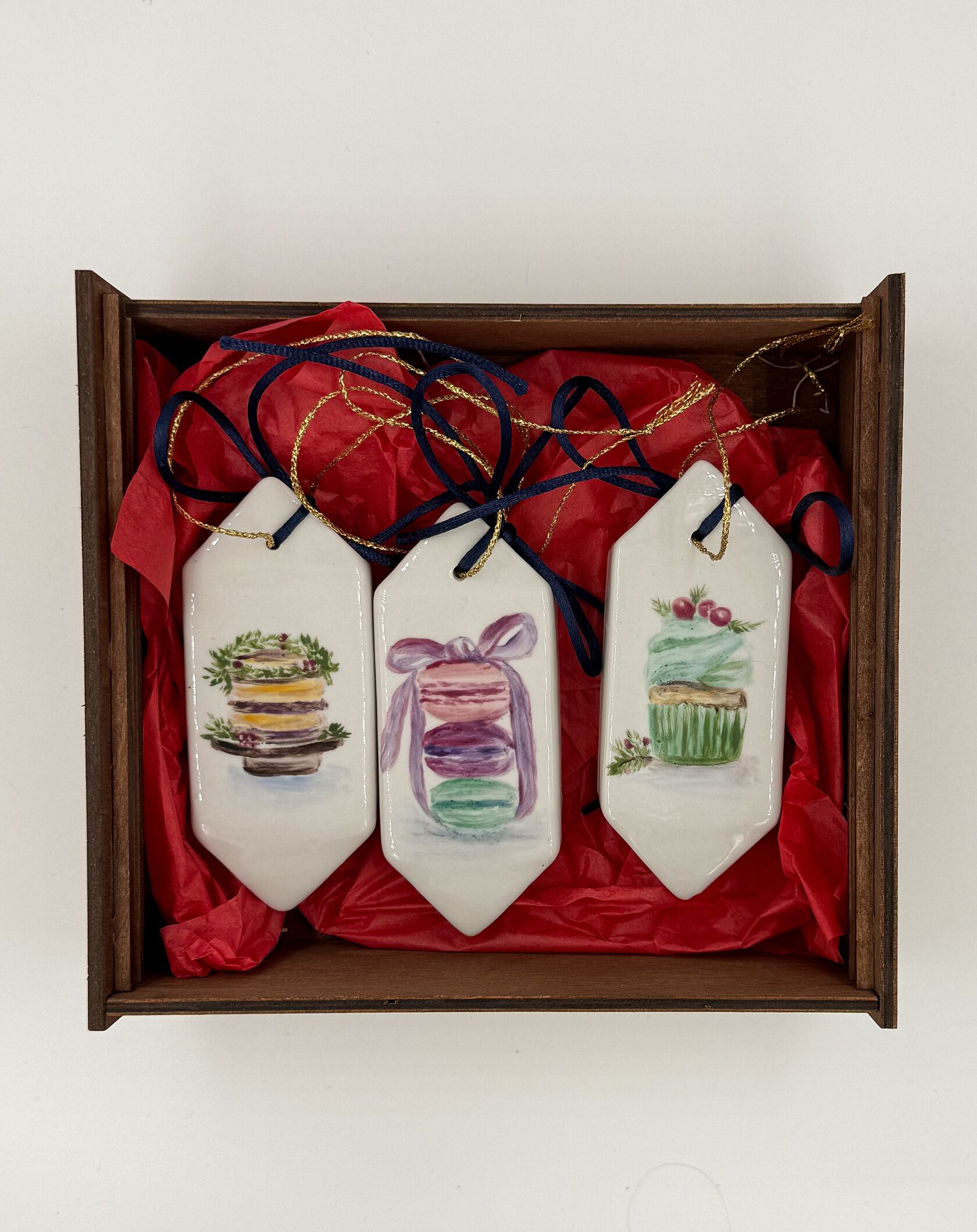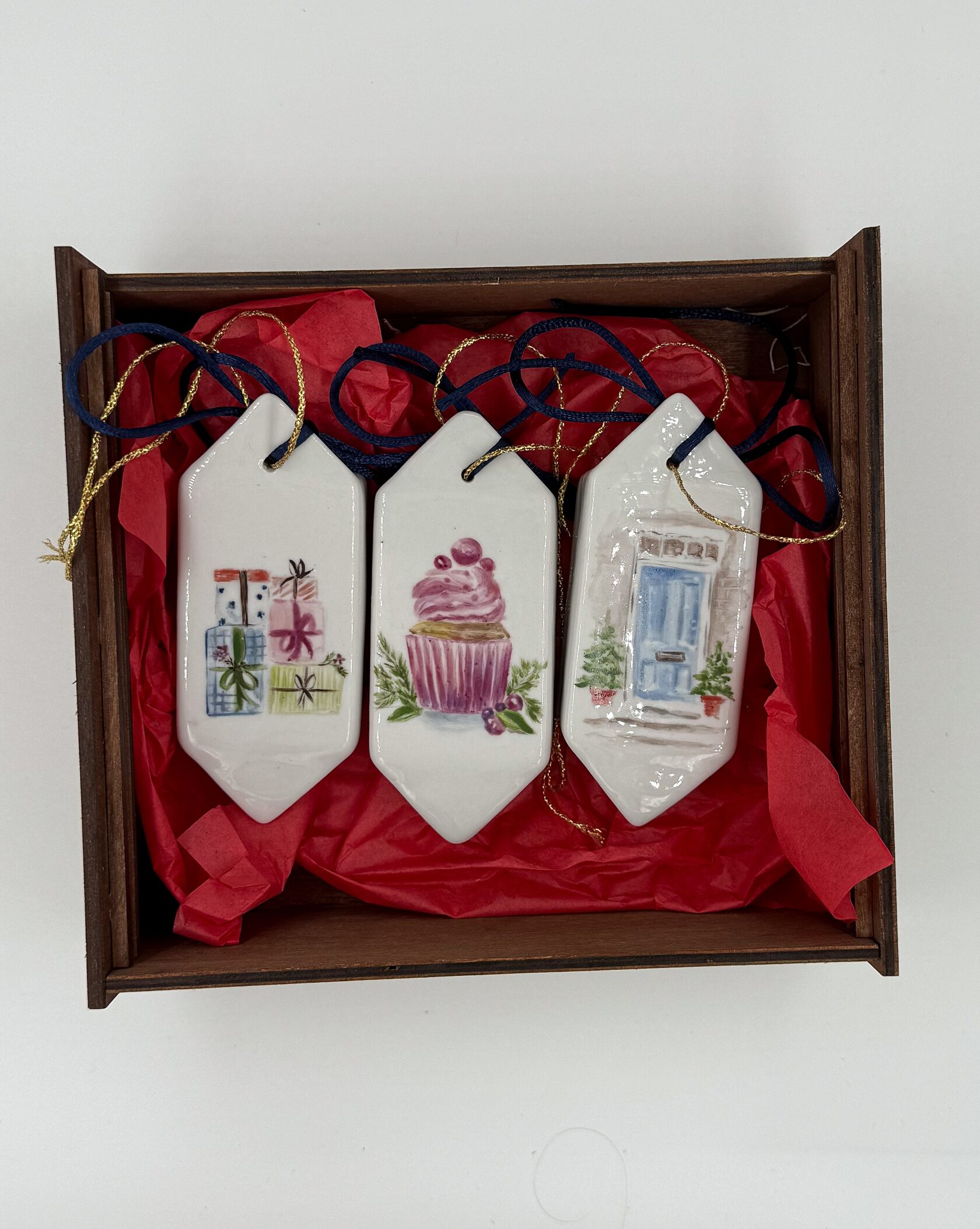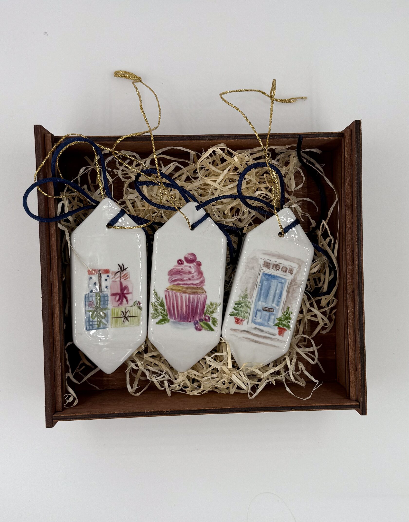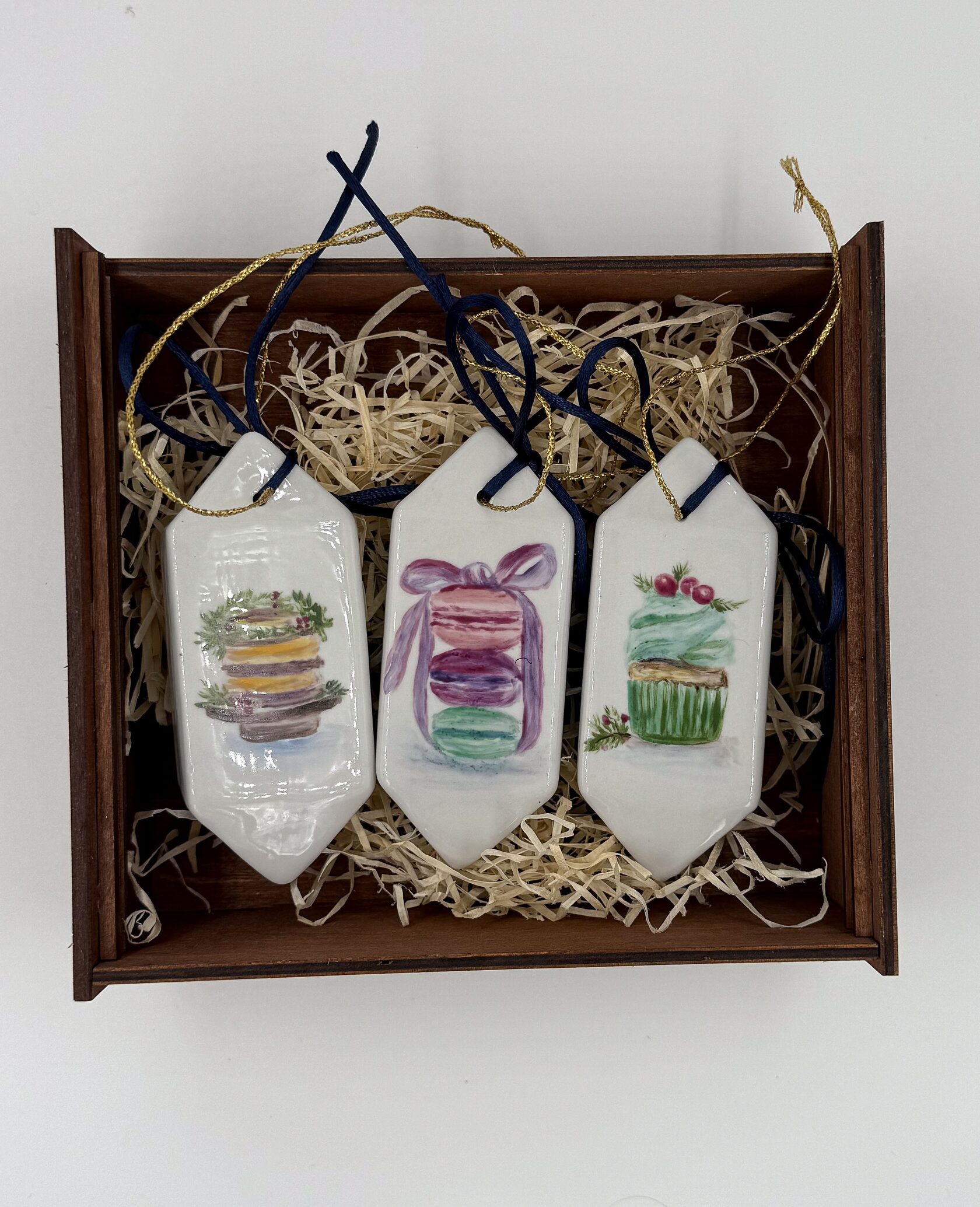 Праздничные наборы фарфоровых конфет украшены ручной росписью. Каждый экземпляр имеет свой символ-ассоциацию с праздником, каникулами и зимним настроением. Такие конфеты могут стать оригинальным украшением или необычным подарком.