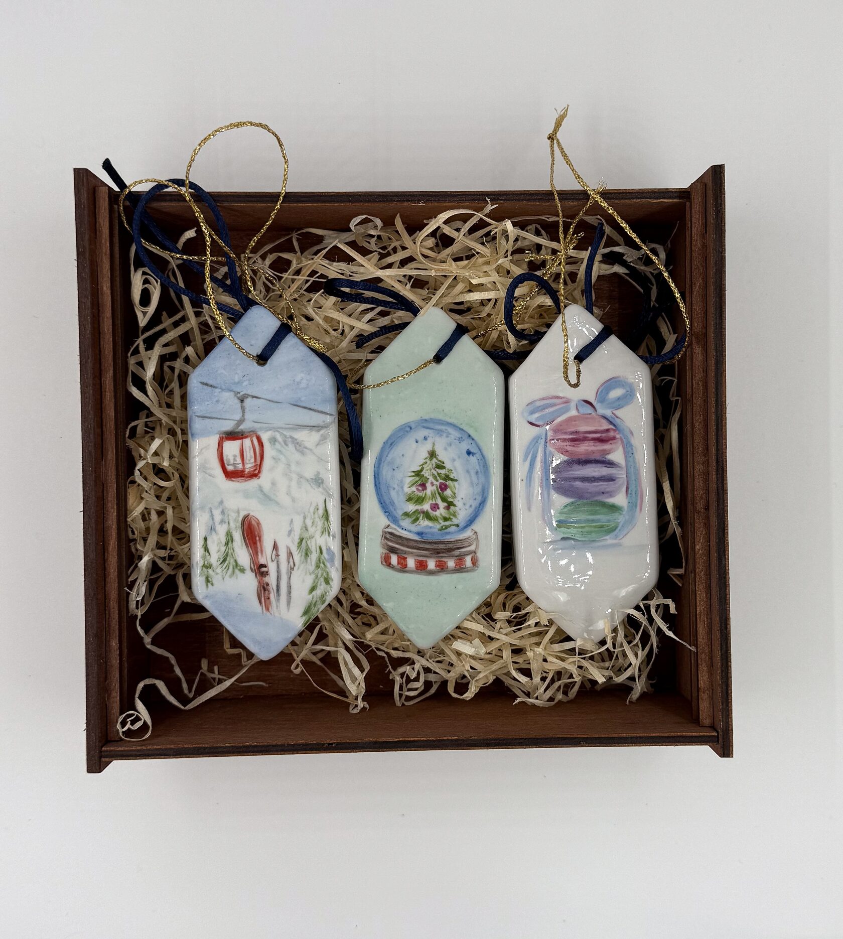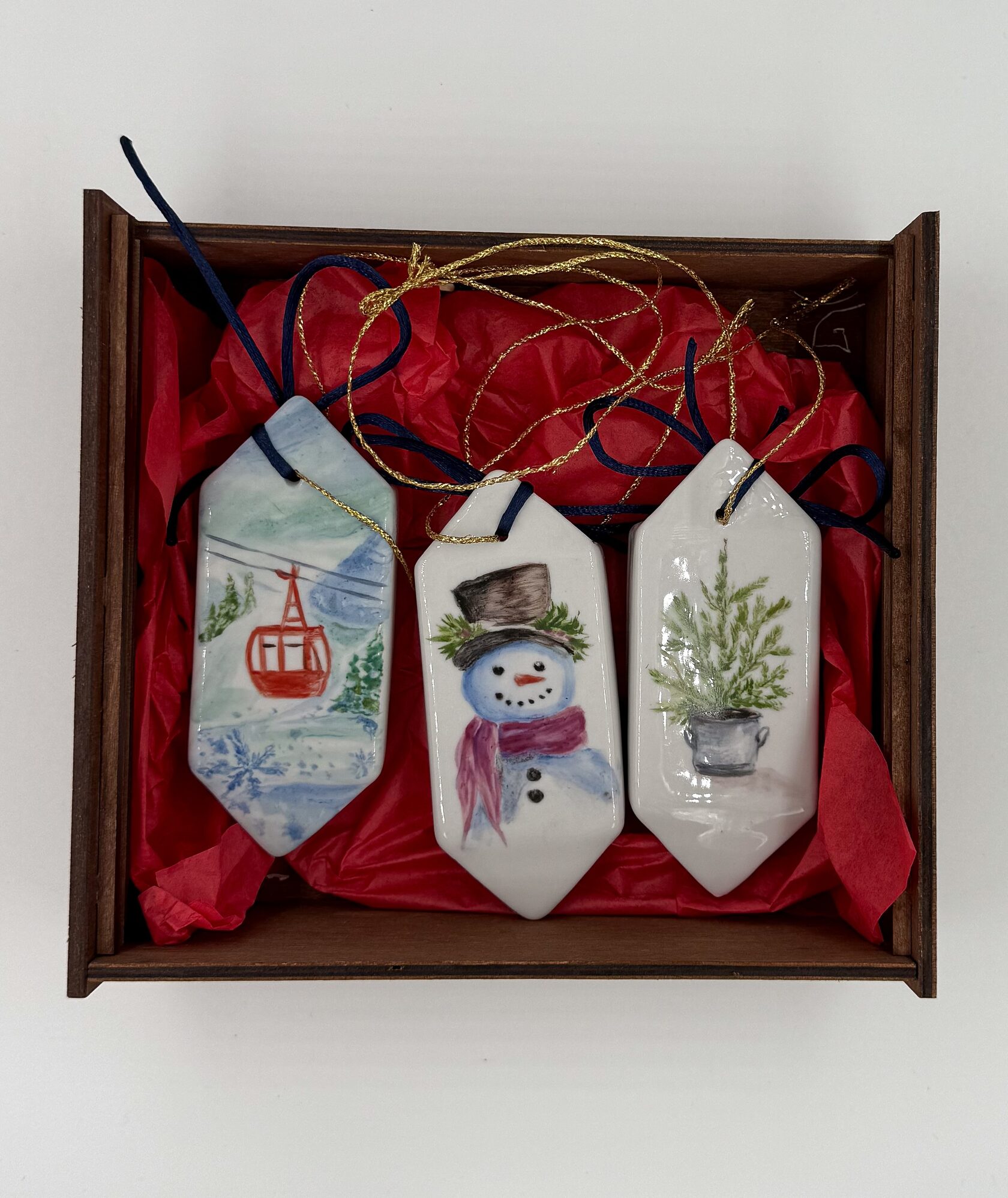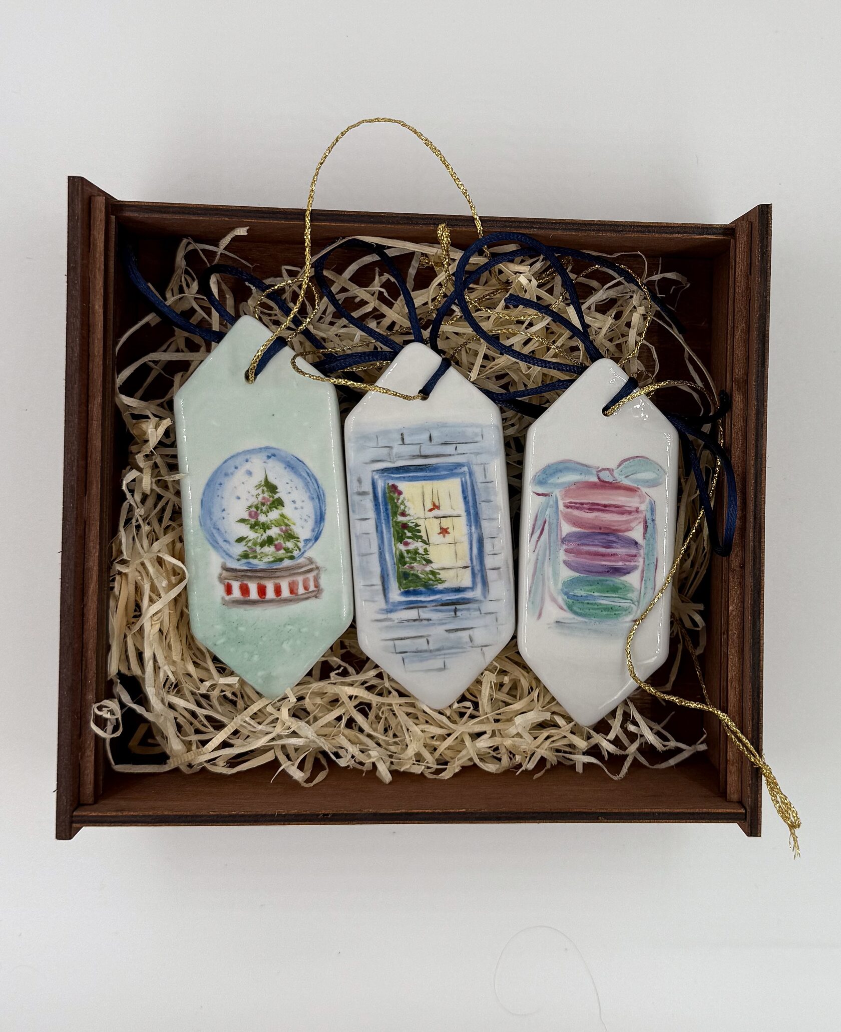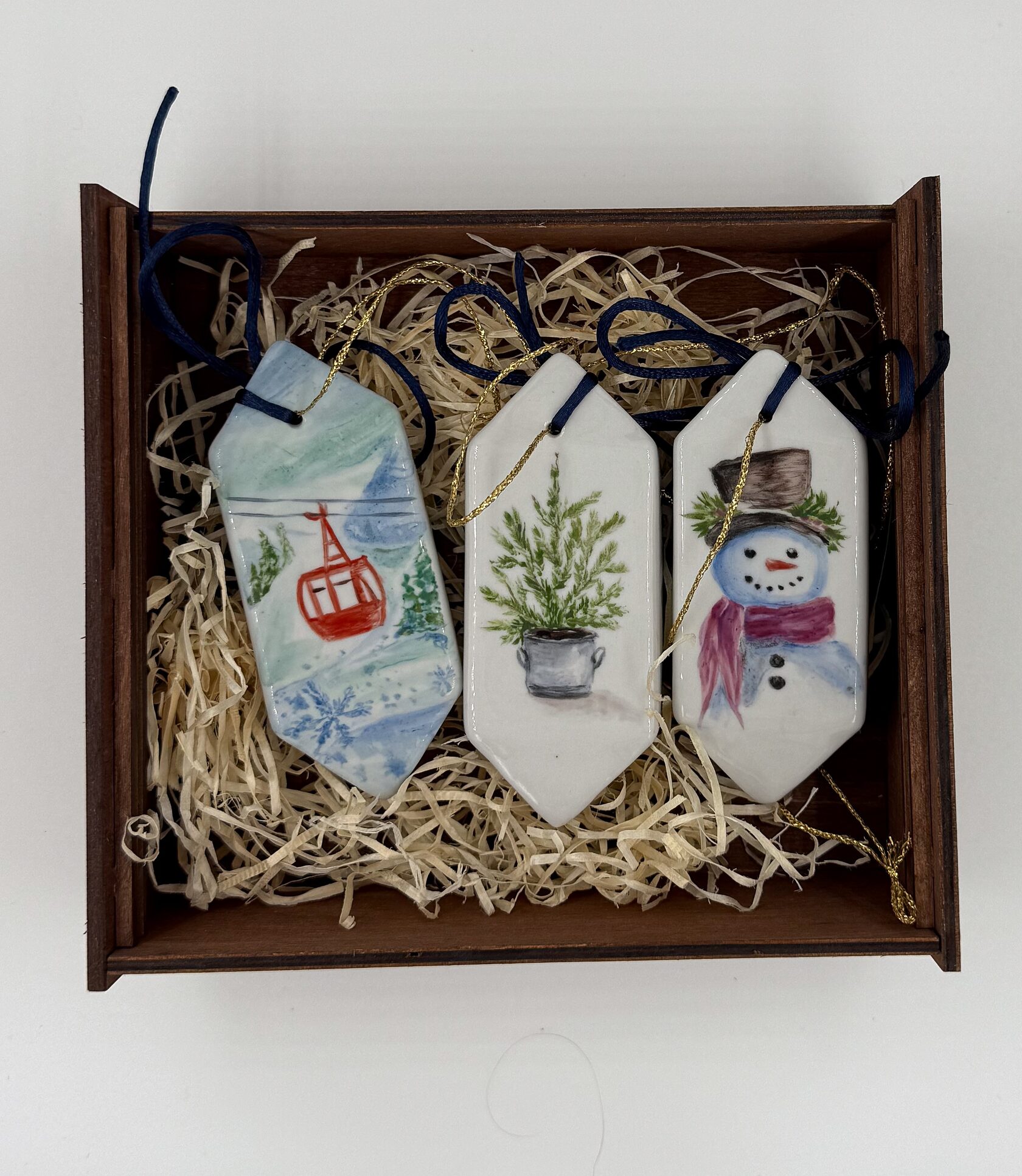 Изысканные фарфоровые изделия, украшенные тонкой художественной росписью. Каждая миниатюра отражает атмосферу зимнего сезона: спокойные пейзажи, уютные домики, праздничные символы и мягкие акварельные оттенки, передающие ощущение тепла и света.
