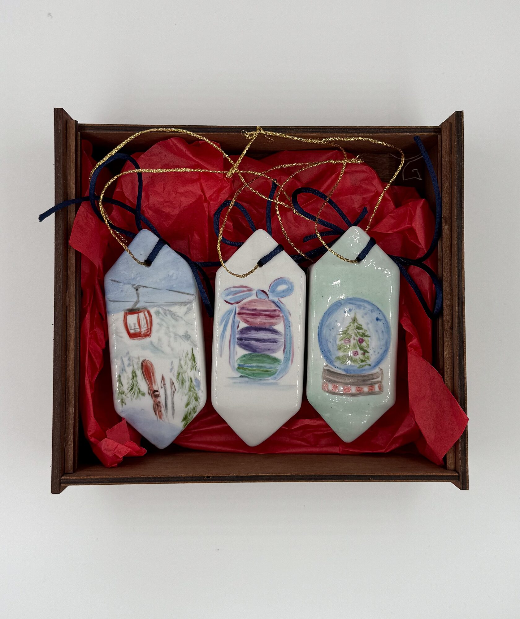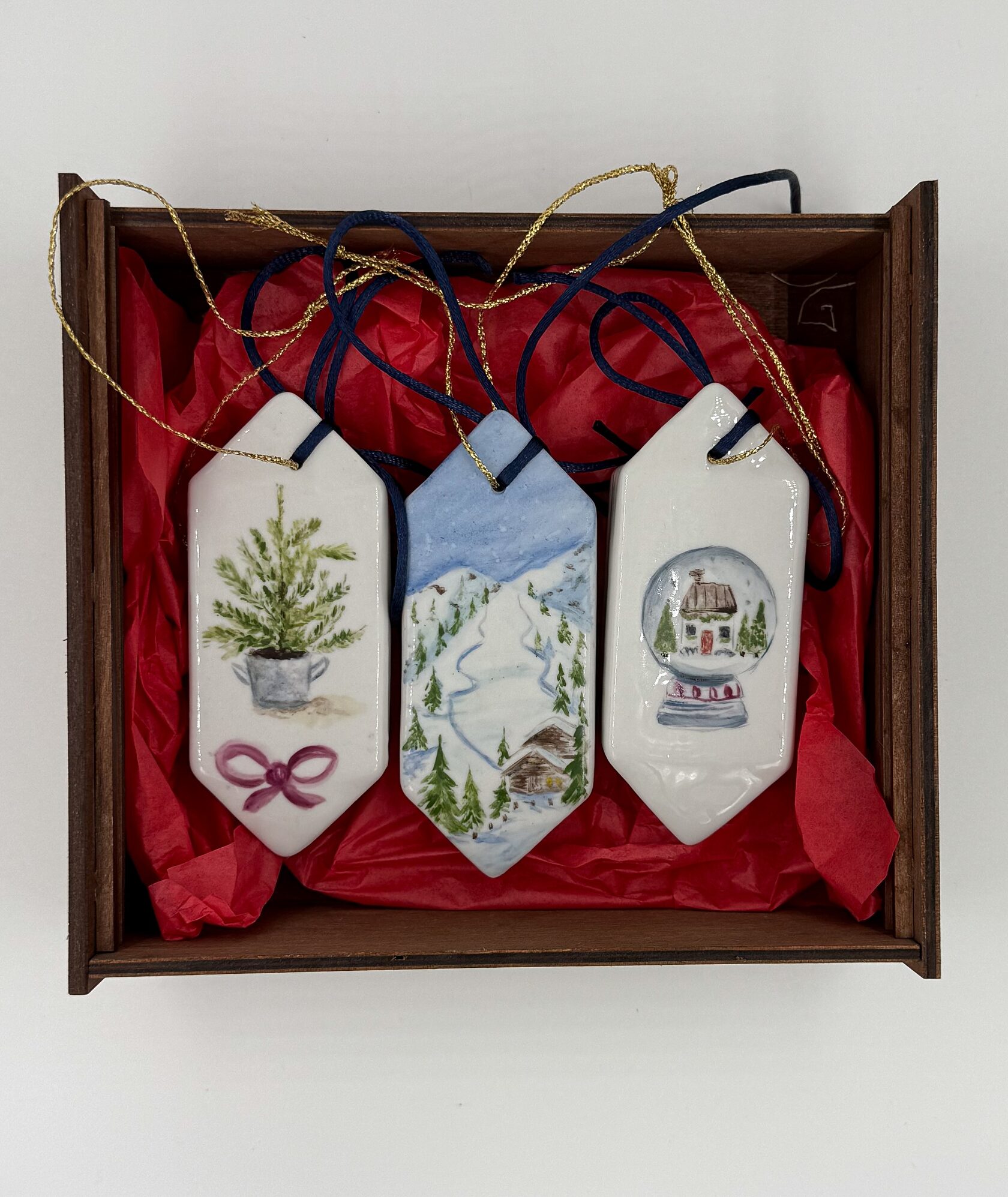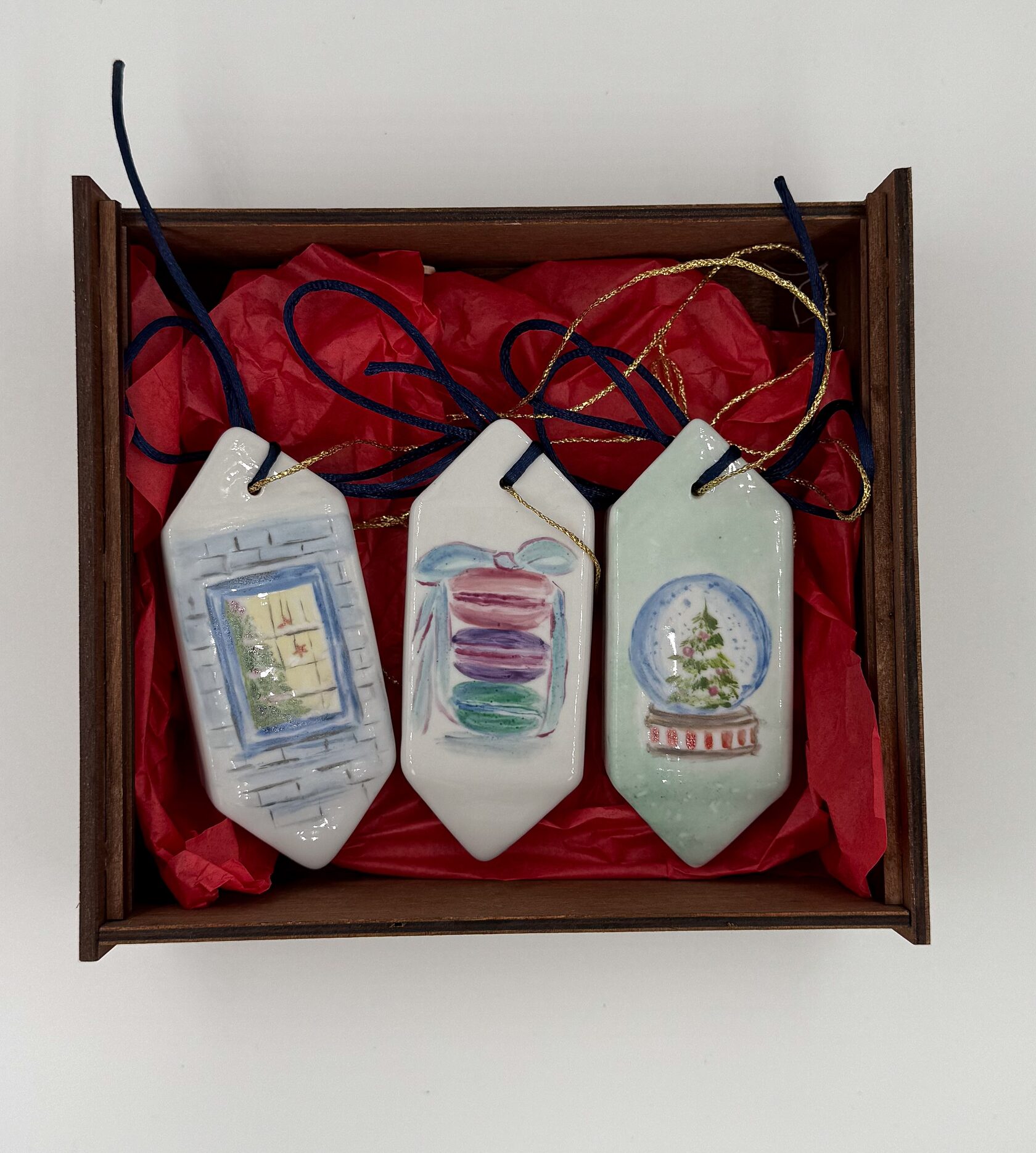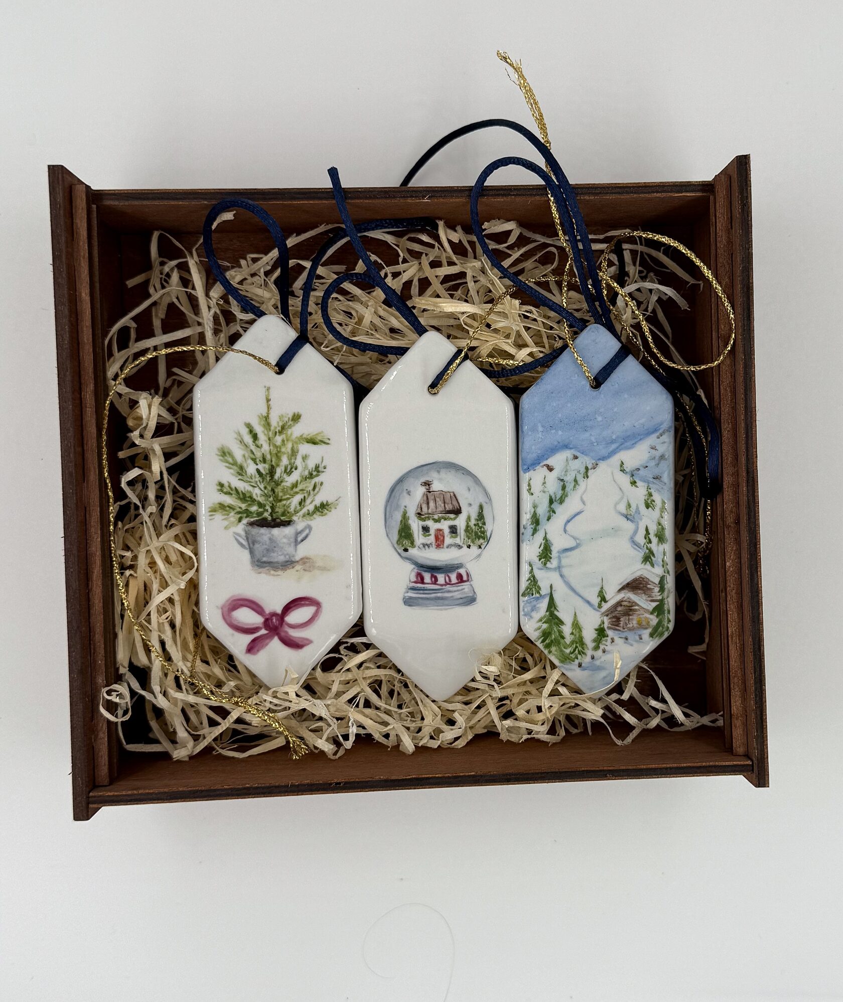 Изысканные фарфоровые изделия, украшенные тонкой художественной росписью. Каждая миниатюра отражает атмосферу зимнего сезона: спокойные пейзажи, уютные домики, праздничные символы и мягкие акварельные оттенки, передающие ощущение тепла и света.